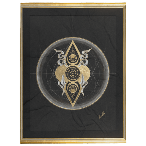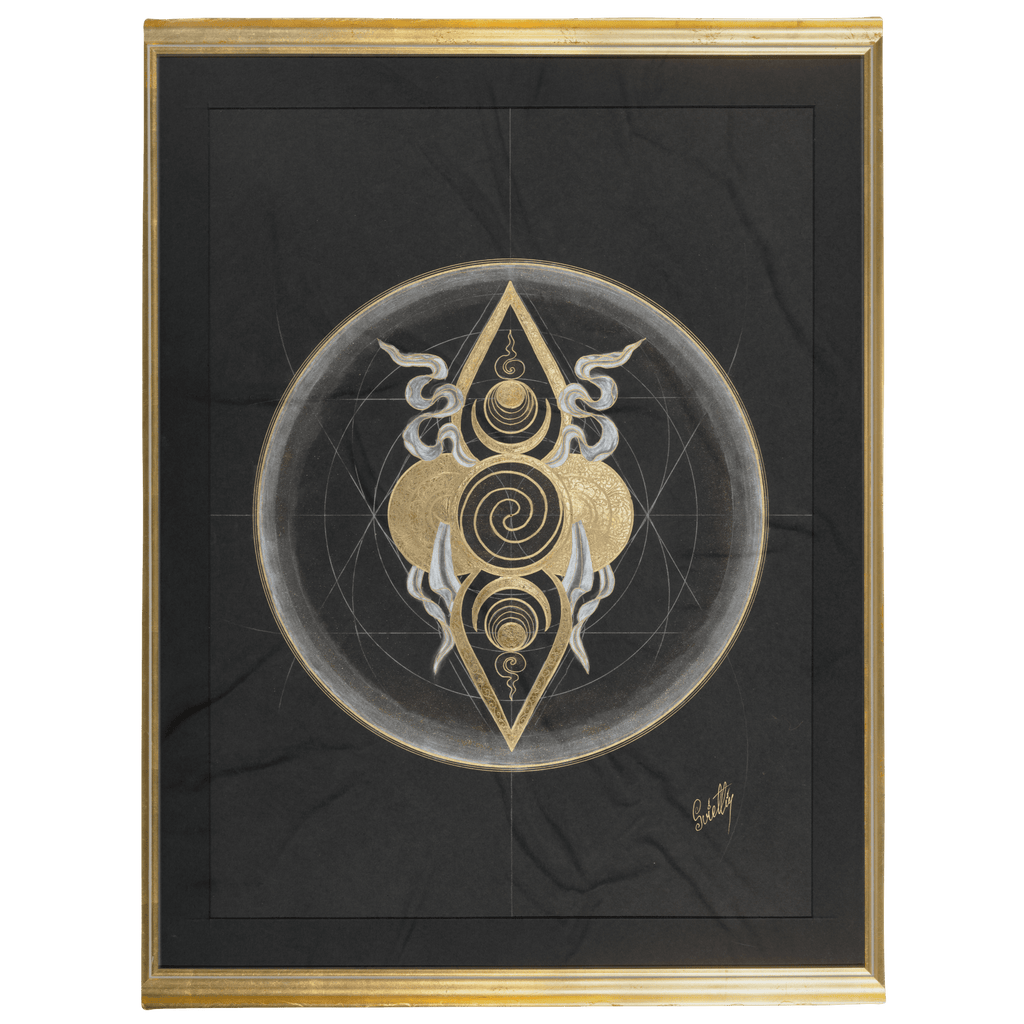 The artwork is mixed media. There is a glowing gold sparkling halo that encompasses the five senses offering.