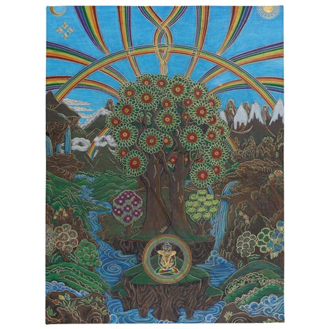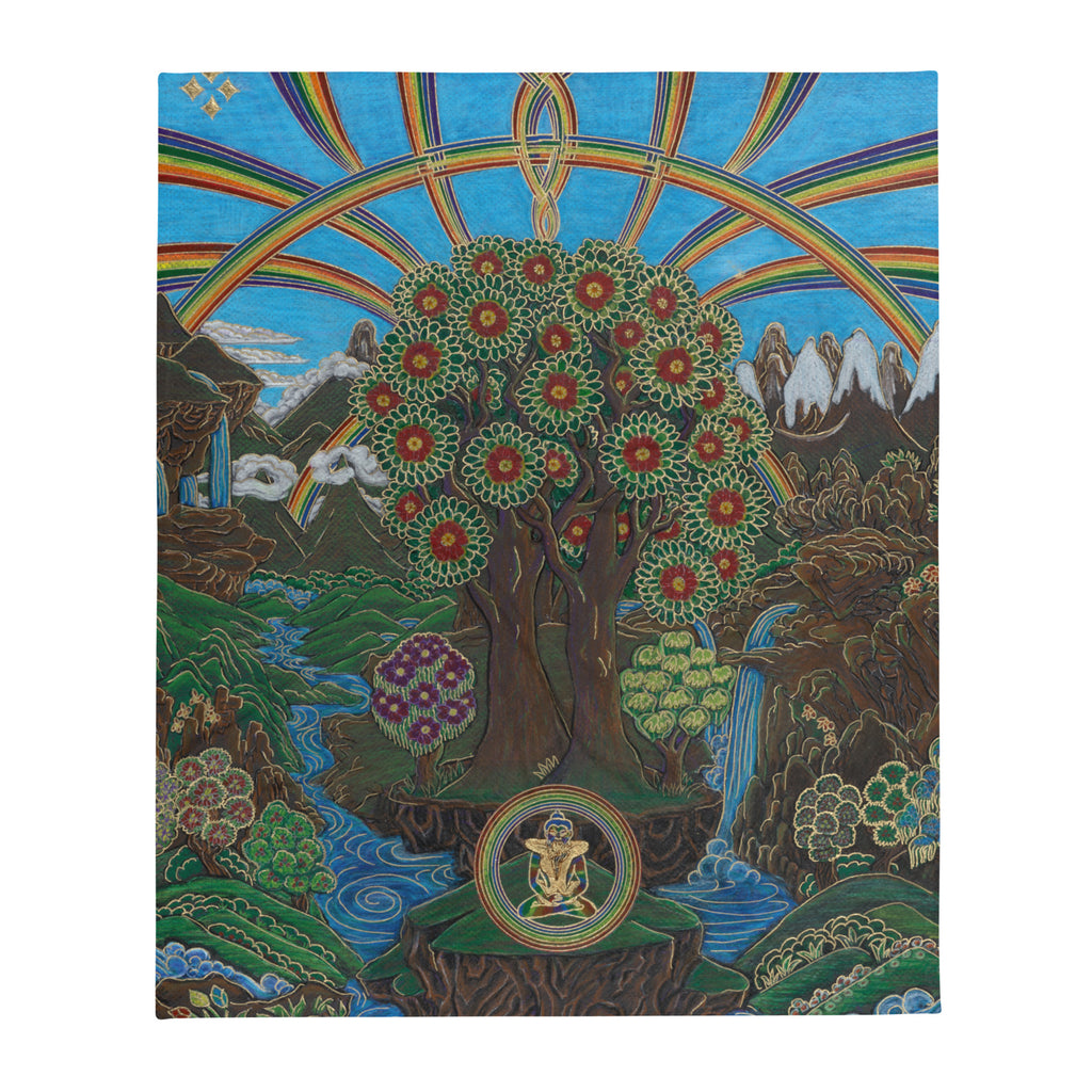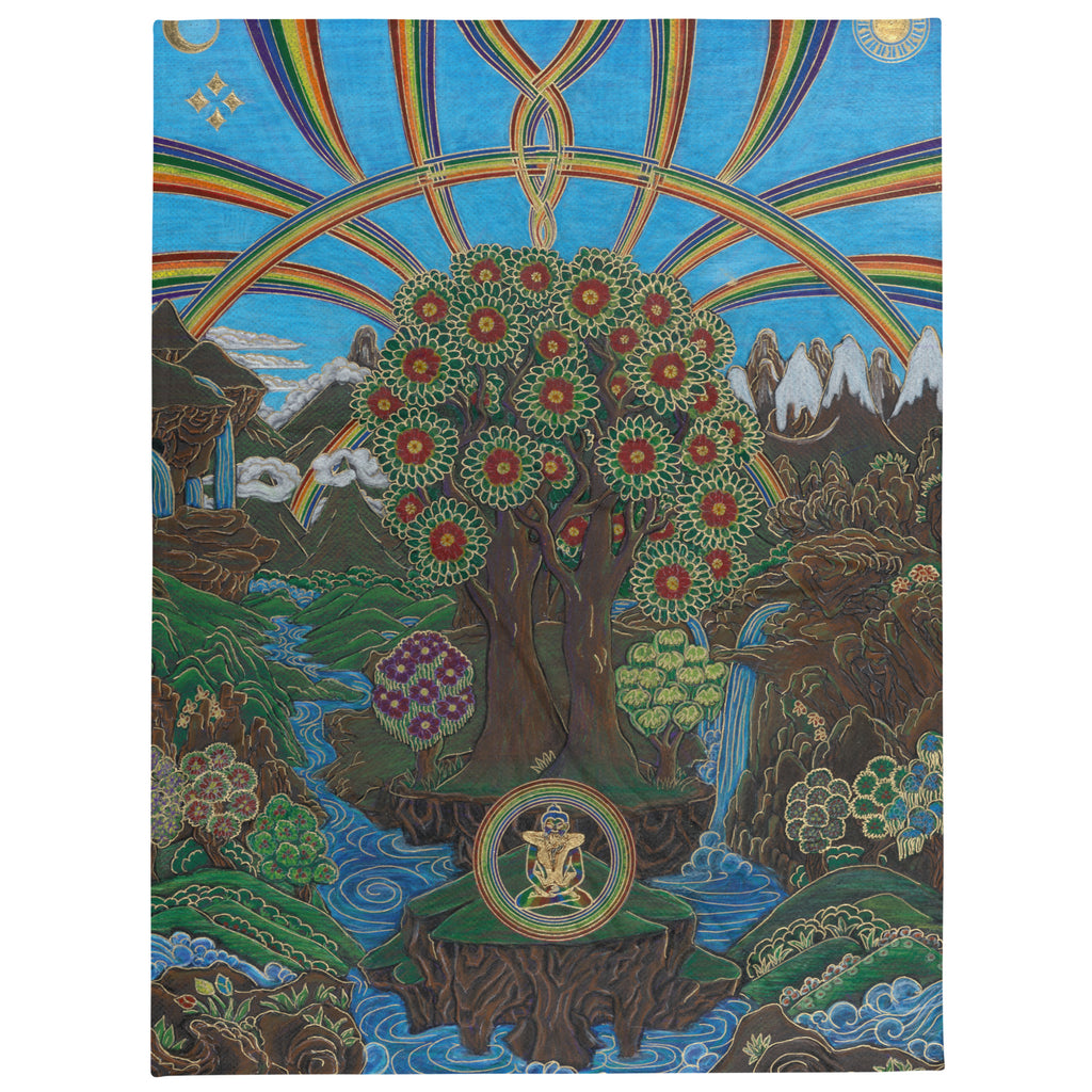 At the bottom of this artwork, you see in the circle a depiction of wisdom and compassion with YabYum. The rainbows, running water, mountains and eucalyptus trees all serve as the symbolism of abundance. At the top, you can see the balance of Divine Feminine and Divine Masculine being showcased in the artwork as this is the true energetic nature of this land.