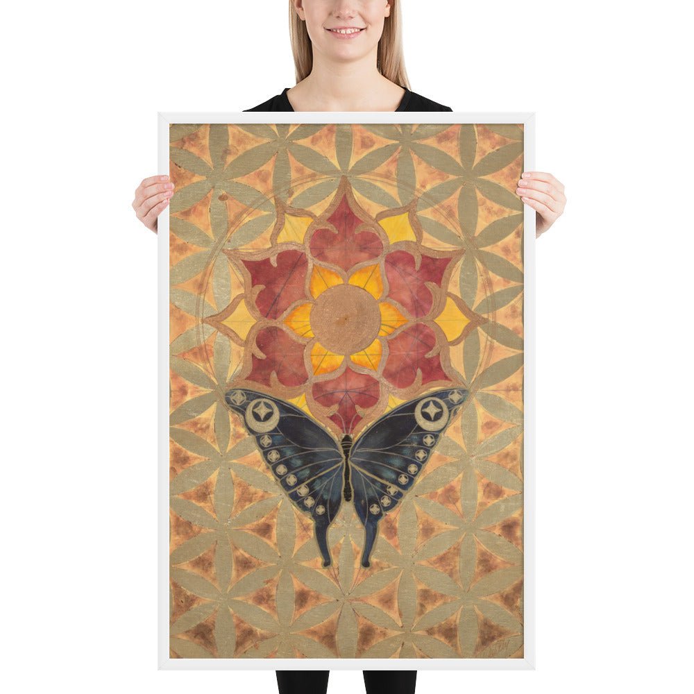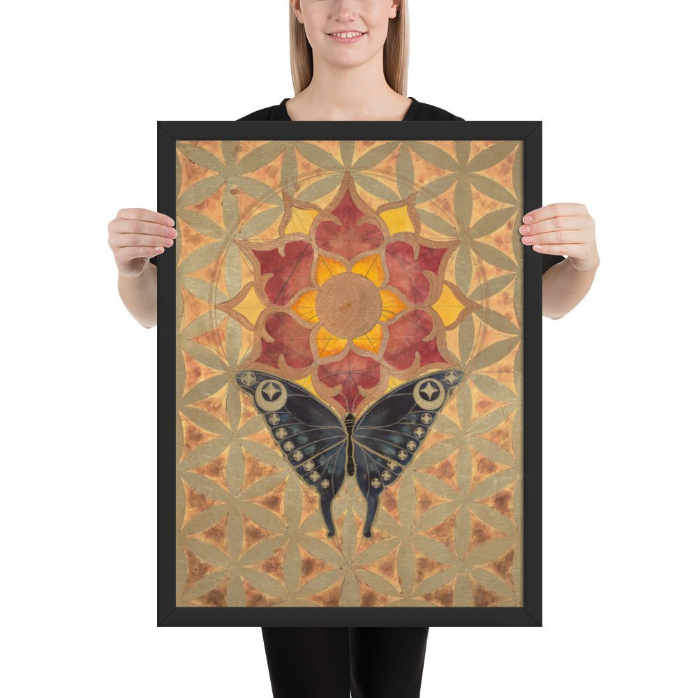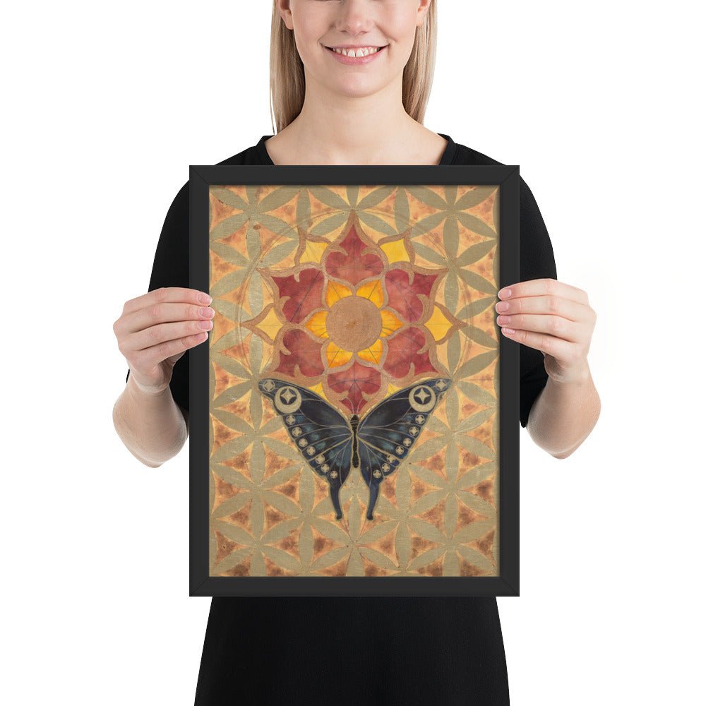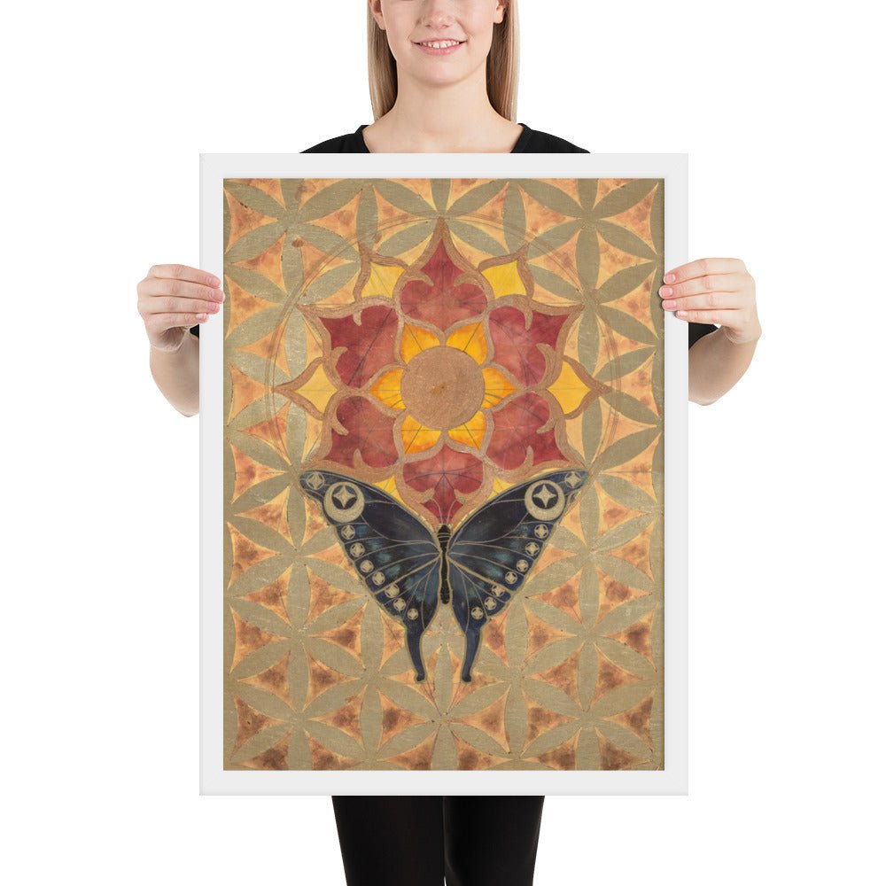 The butterfly's journey towards the sun-lotus signifies the soul's aspiration for higher consciousness and the unfolding of spiritual awareness. The moth's navigation towards the lunar glow stands for our intuitive understanding and the acceptance of the unseen guiding forces in our lives. The mirrored geometrical patterns across both pieces speak of the interconnectedness of all things, the dance of light and shadow that shapes our reality.