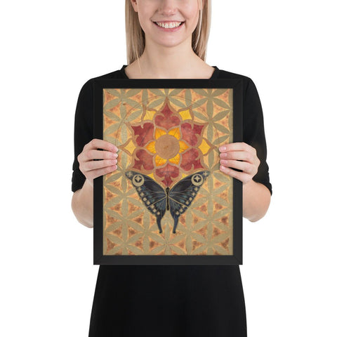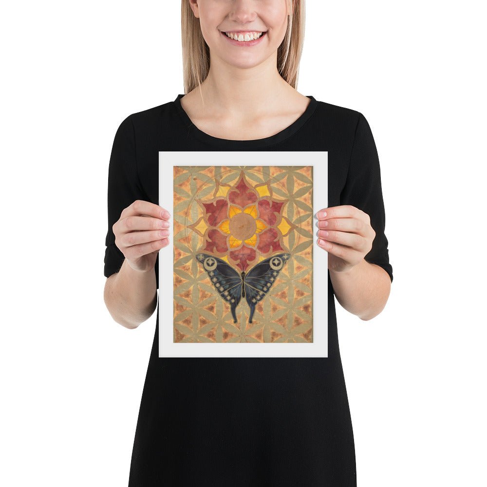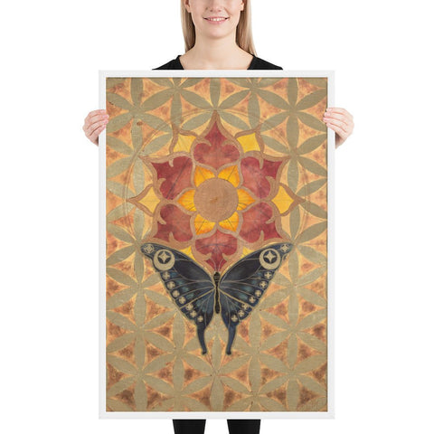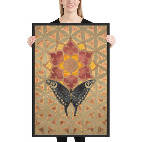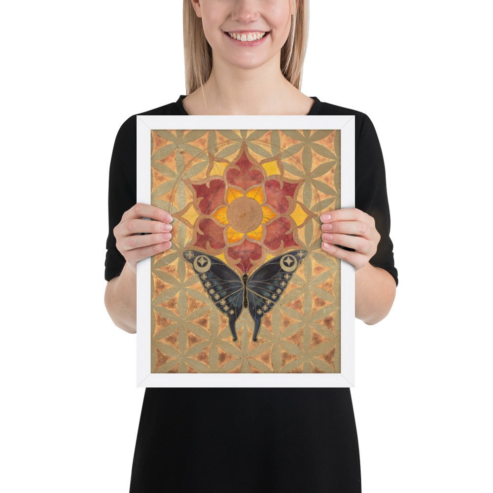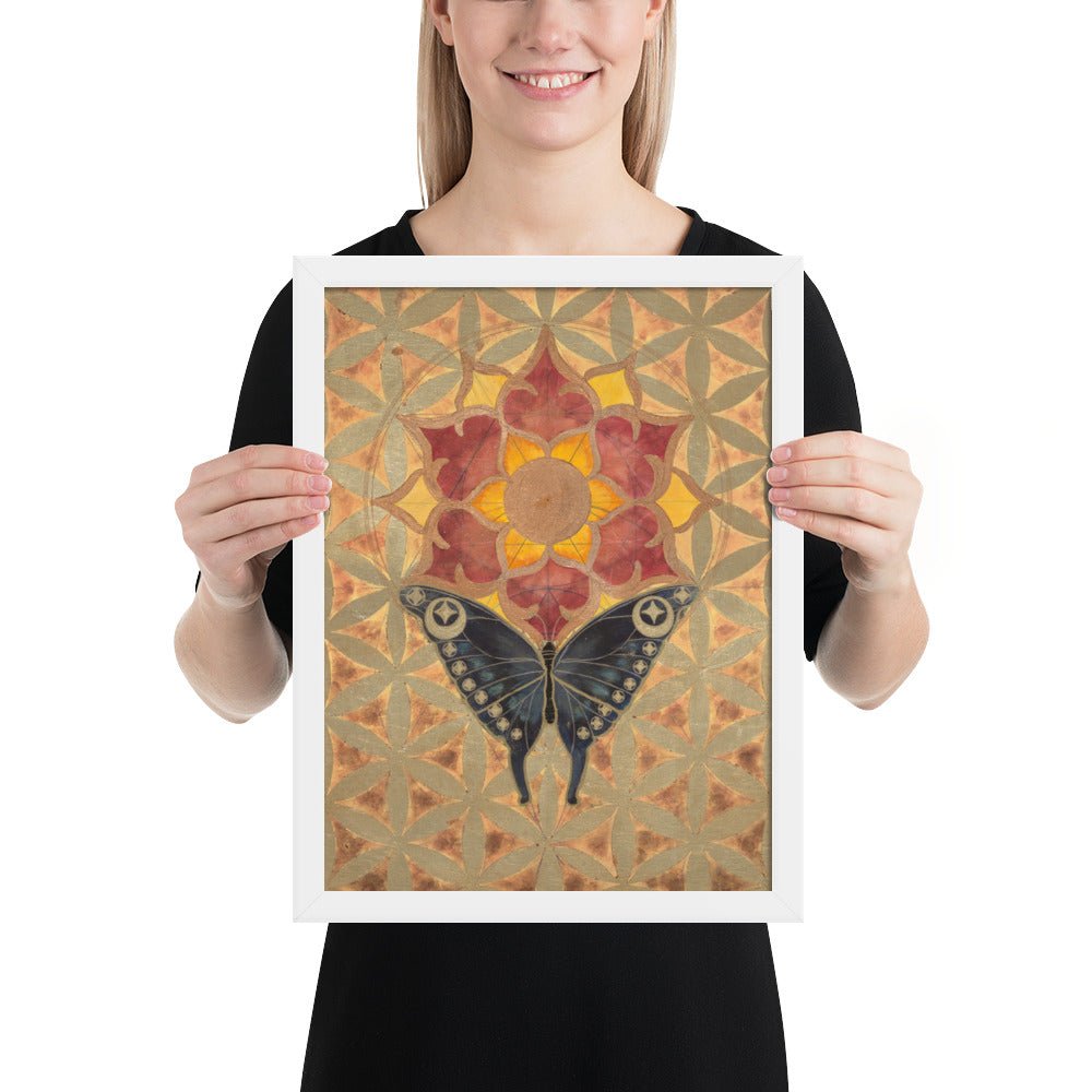 The butterfly's journey towards the sun-lotus signifies the soul's aspiration for higher consciousness and the unfolding of spiritual awareness. The moth's navigation towards the lunar glow stands for our intuitive understanding and the acceptance of the unseen guiding forces in our lives. The mirrored geometrical patterns across both pieces speak of the interconnectedness of all things, the dance of light and shadow that shapes our reality.
