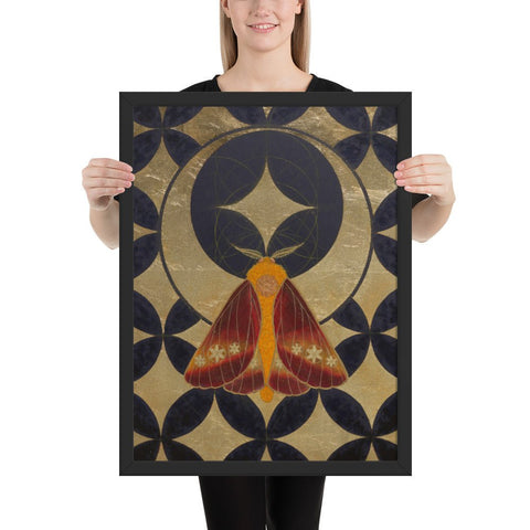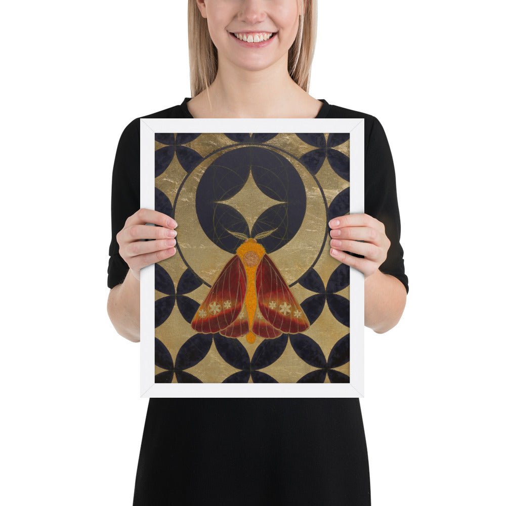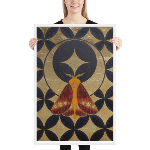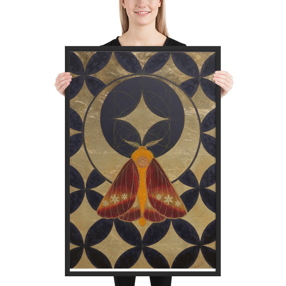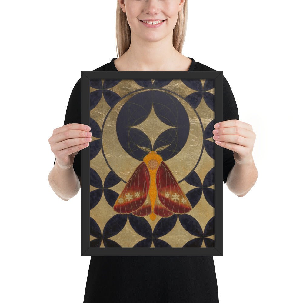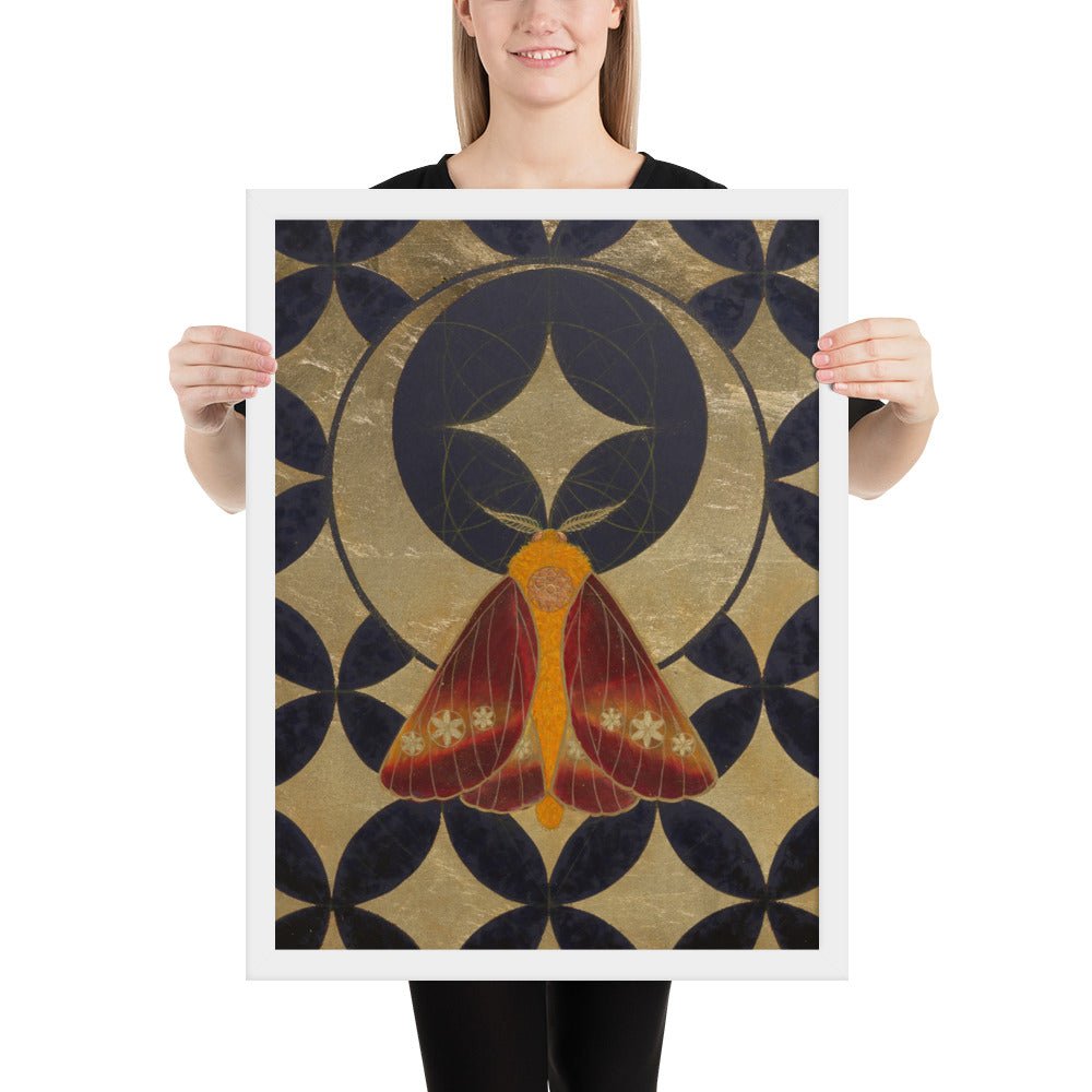 The butterfly's journey towards the sun-lotus signifies the soul's aspiration for higher consciousness and the unfolding of spiritual awareness. The moth's navigation towards the lunar glow stands for our intuitive understanding and the acceptance of the unseen guiding forces in our lives. The mirrored geometrical patterns across both pieces speak of the interconnectedness of all things, the dance of light and shadow that shapes our reality.