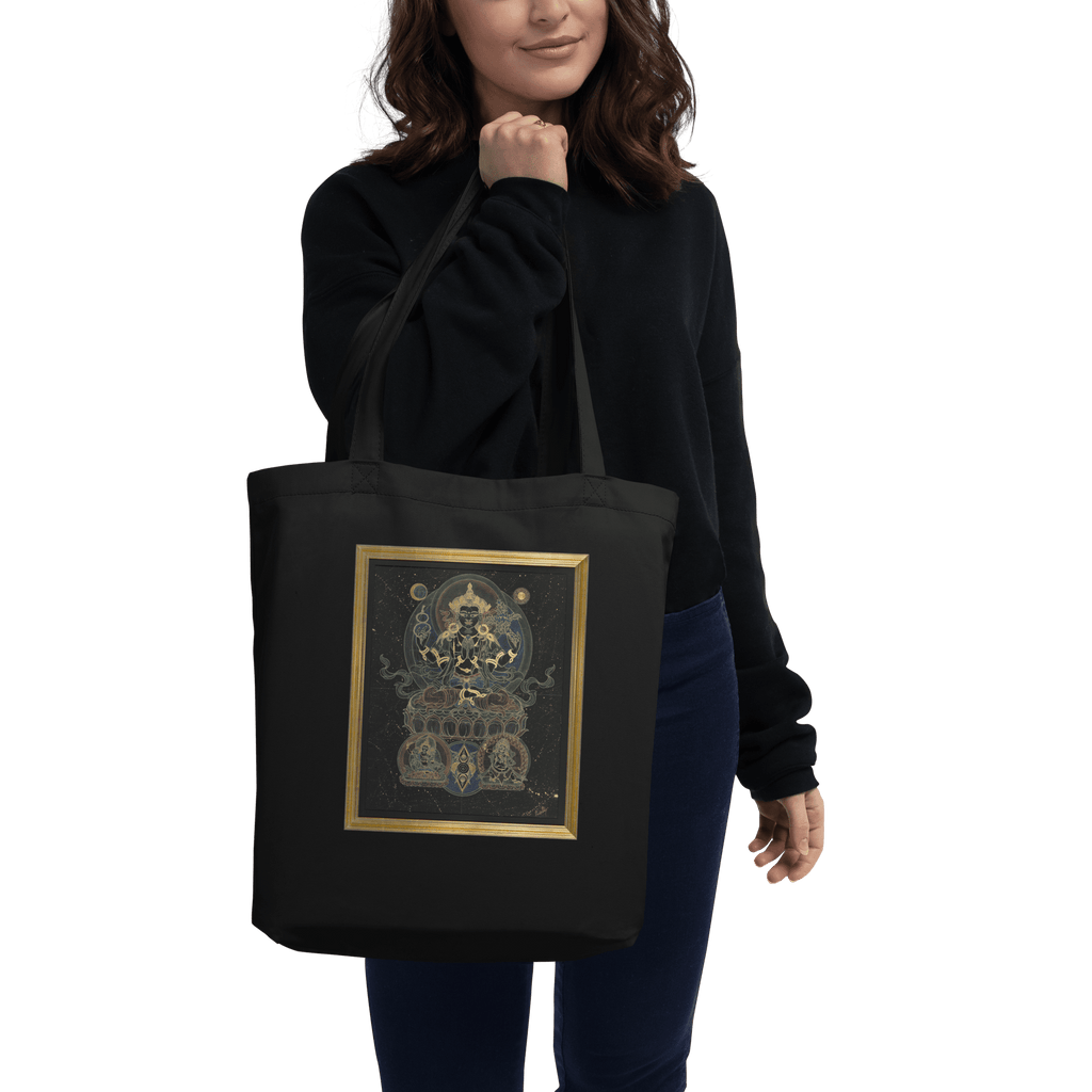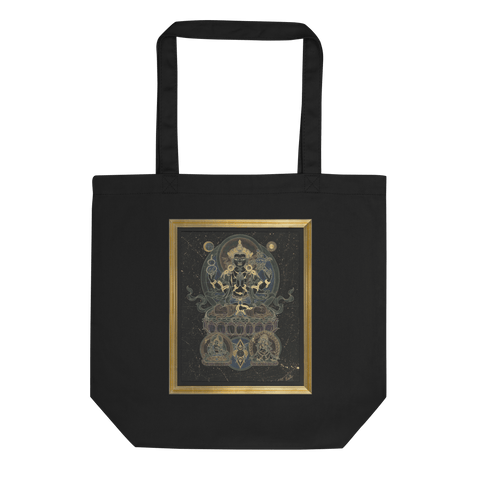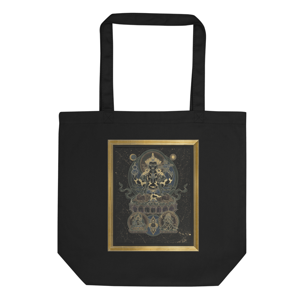 Avalokiteshvara sits at the center, embodying boundless compassion as the Bodhisattva who hears the cries of the world. To his left, Manjushri wields the flaming sword, cutting through the ignorance with his wisdom. To his right, Vajrapani radiates the spiritual strength to overcome obstacles on the path to spiritual realization. Above, the symbiosis of the Divine Masculine and Feminine signifies the perfect equilibrium necessary for the attainment of Nirvana.