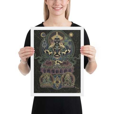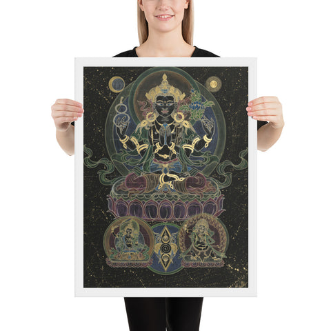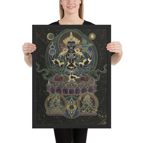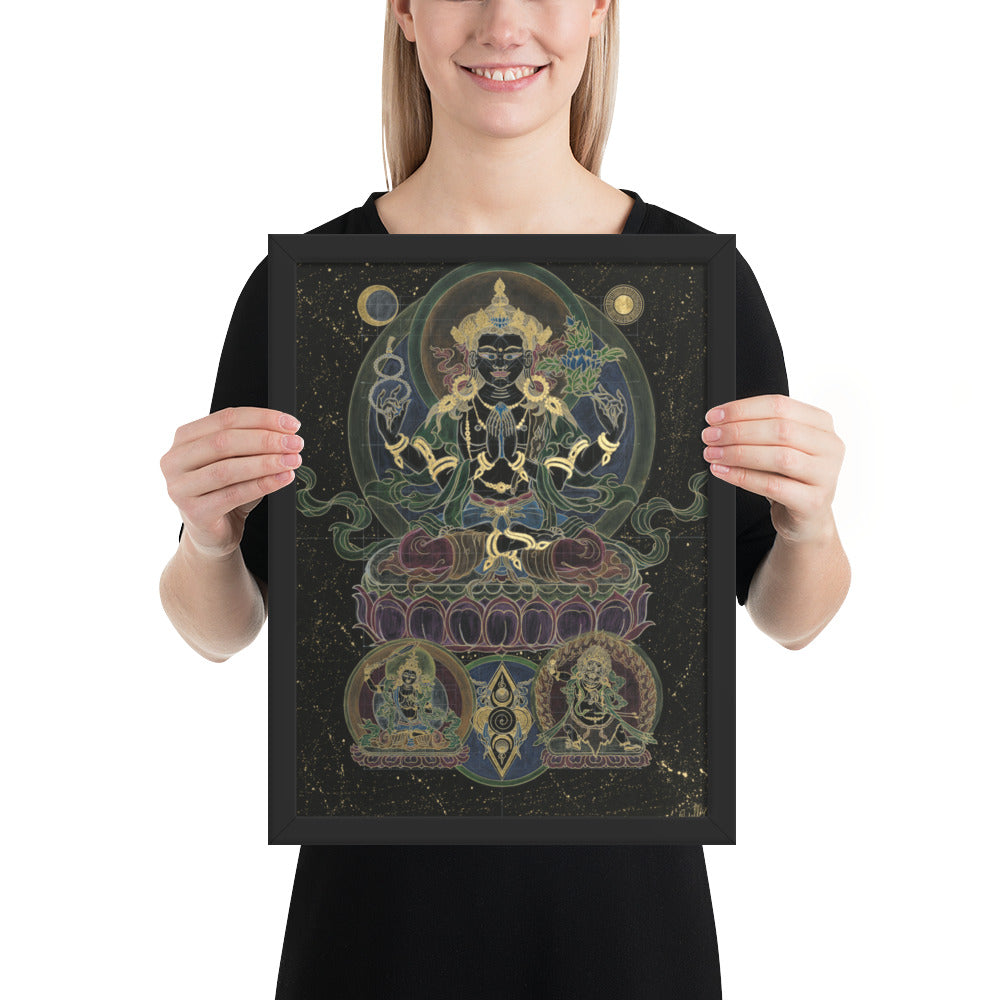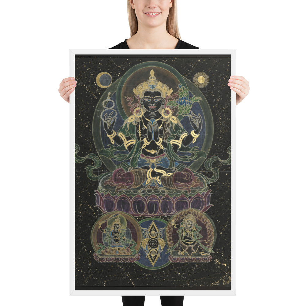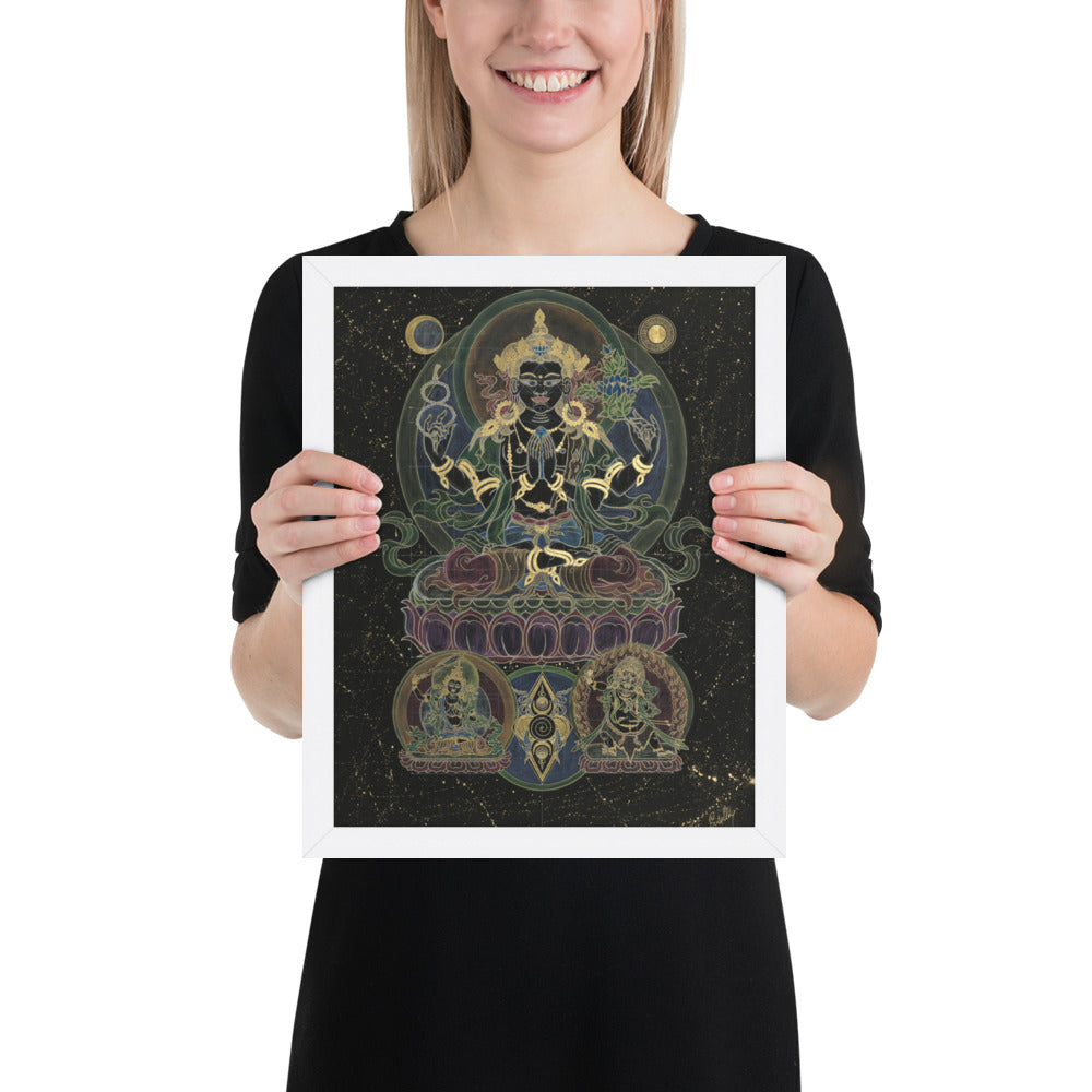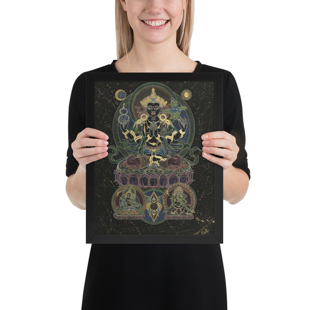 Avalokiteshvara sits at the center, embodying boundless compassion as the Bodhisattva who hears the cries of the world. To his left, Manjushri wields the flaming sword, cutting through the ignorance with his wisdom. To his right, Vajrapani radiates the spiritual strength to overcome obstacles on the path to spiritual realization. Above, the symbiosis of the Divine Masculine and Feminine signifies the perfect equilibrium necessary for the attainment of Nirvana.