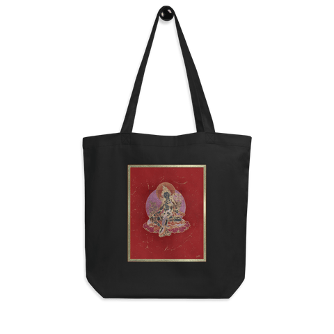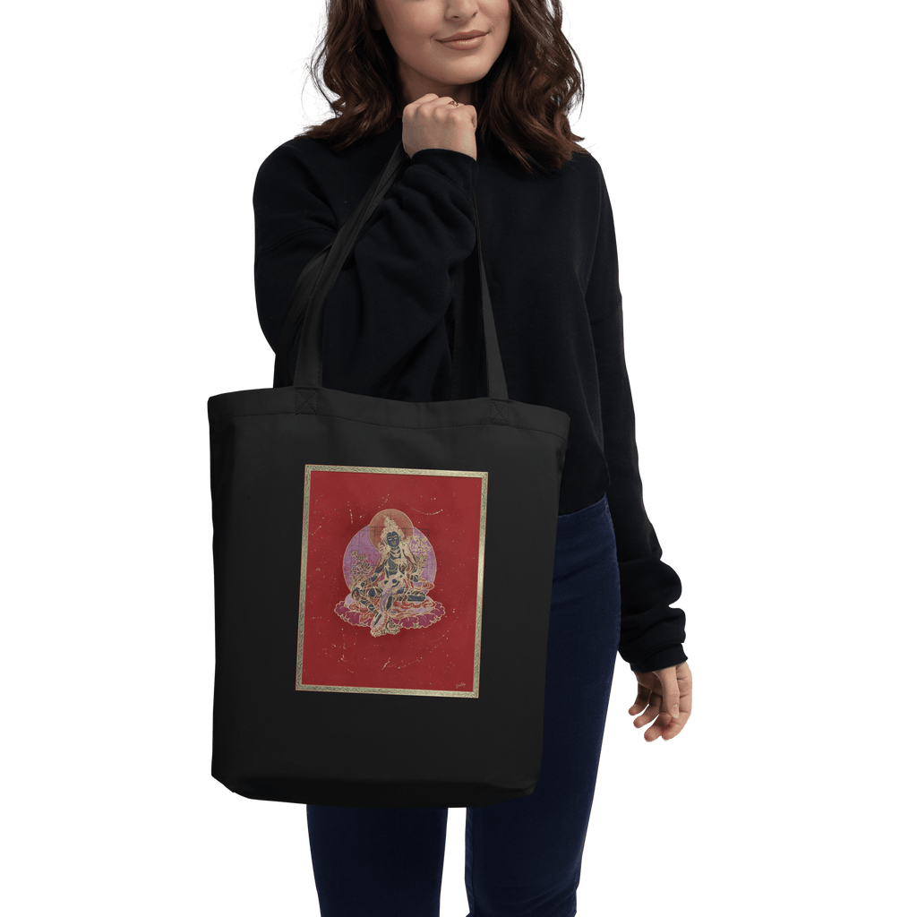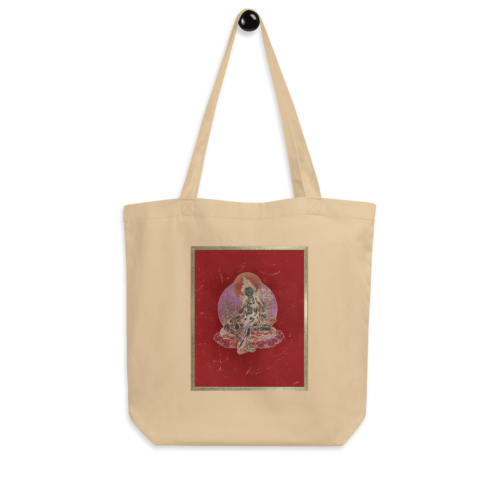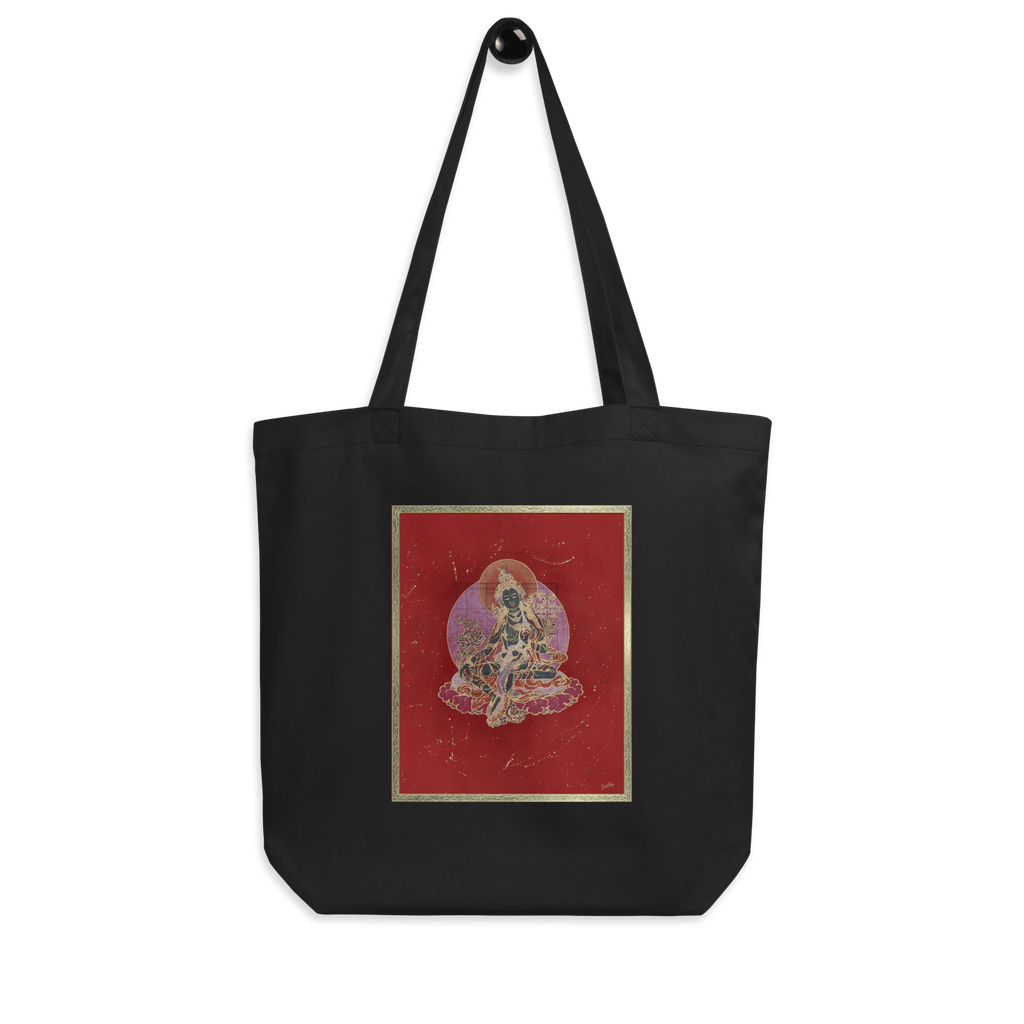 Green Tara is often depicted in lalitasana (an attitude of ease), symbolizing the perfect balance of wisdom and creativity. Her right leg is extended, signifying readiness to move forward at any moment. Her left leg is folded in the meditative attitude on the lotus pedestal. Her left hand is positioned in a gesture of granting refuge, holding Utpala (blue lotus) that floats over her left shoulder and symbolizes purity and power. Her right hand is showing the outward-facing palm and downward hand, the Varada Mudra or Mudra of Generosity.