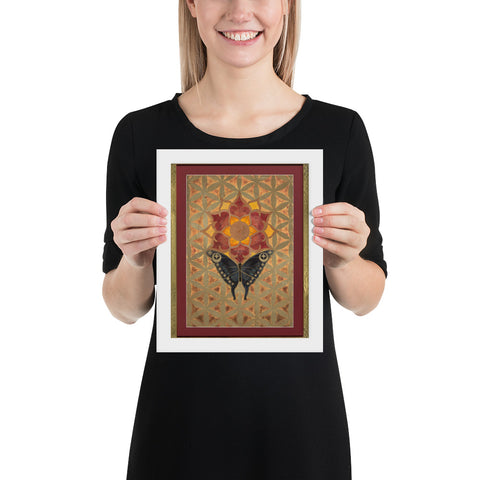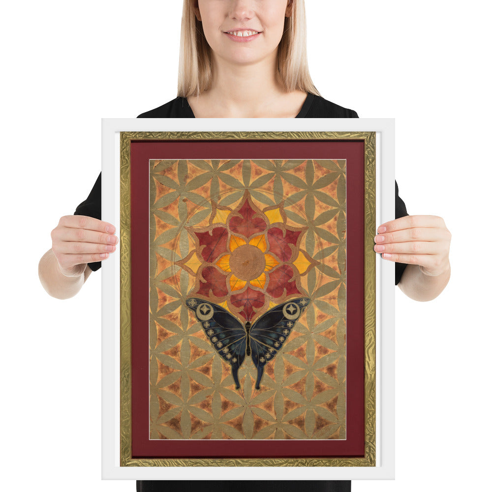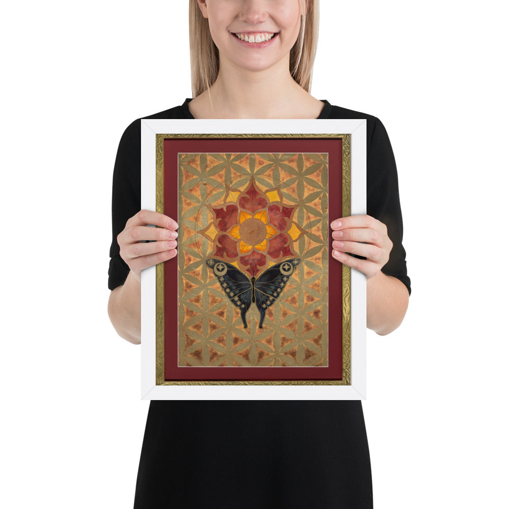 The butterfly's journey towards the sun-lotus signifies the soul's aspiration for higher consciousness and the unfolding of spiritual awareness. The moth's navigation towards the lunar glow stands for our intuitive understanding and the acceptance of the unseen guiding forces in our lives. The mirrored geometrical patterns across both pieces speak of the interconnectedness of all things, the dance of light and shadow that shapes our reality.