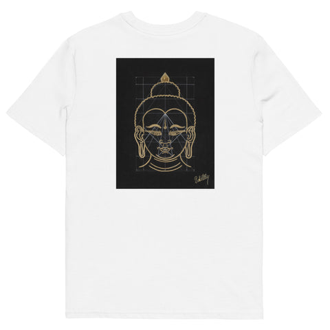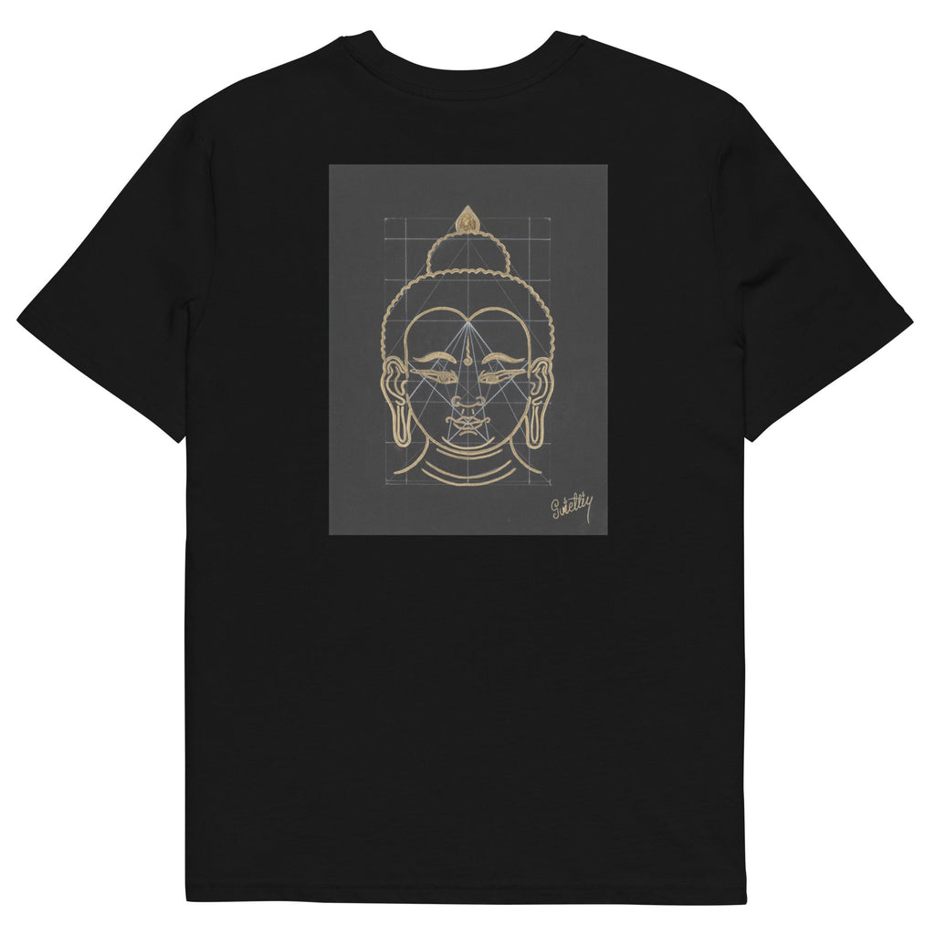 In this Artwork you see Shakyamuni Buddha's perfect body proportions while standing as well as while sitting in the attitude of The Bhumisparsa Mudra or, “The Gesture of Witness.” This plays an important role in the history of the historical Buddha. While Buddha meditated under the Bodhi tree, he was disturbed by Mara, the god of sensual desire, who tempted him by taking the form of a naked girl. But Siddhartha would not deviate from his path to enlightenment, and so he touched the earth with the fingertips of his right hand and said, “the earth shall be my witness, I will not let myself be seduced.”