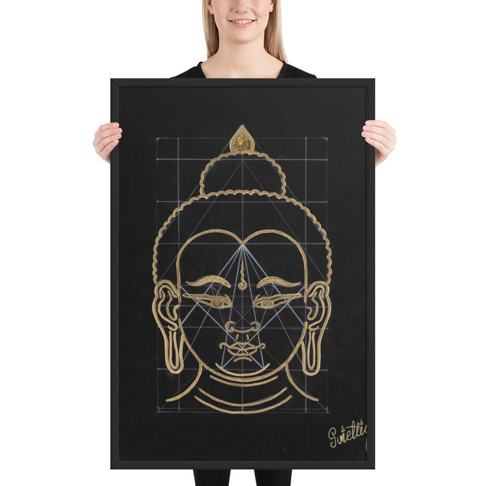 The word “Buddha” means “The One with an Awakened Mind,” derived from the Sanskrit word Buddhi, which translates to “Mind.” The title “Shakyamuni” refers to “The Great Sage of the Sakya Clan,” the lineage from which Buddha originated. In this triptych, Buddha’s head symbolizes the enlightened mind, the calm, wise presence that radiates confidence, awareness, knowledge, and compassion.