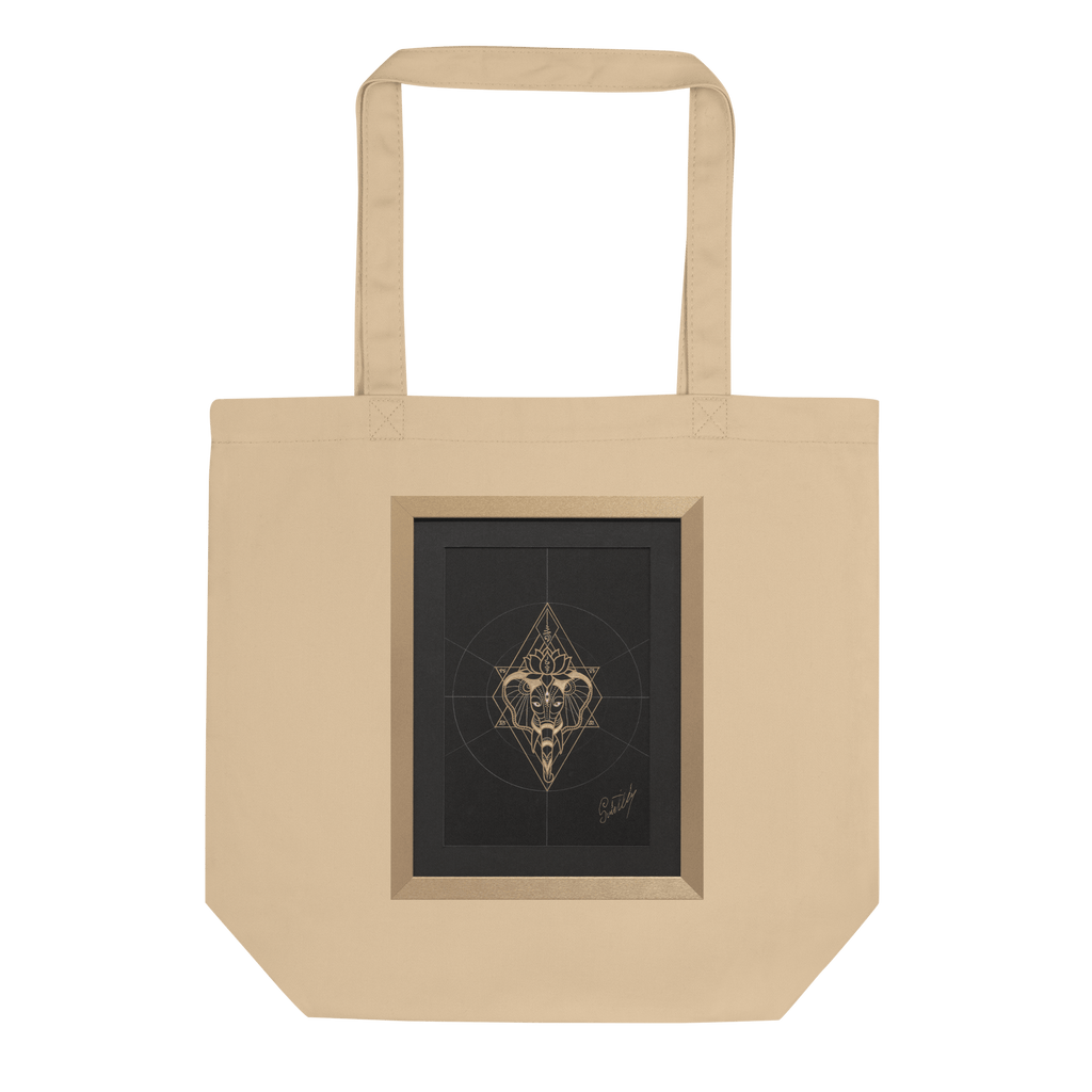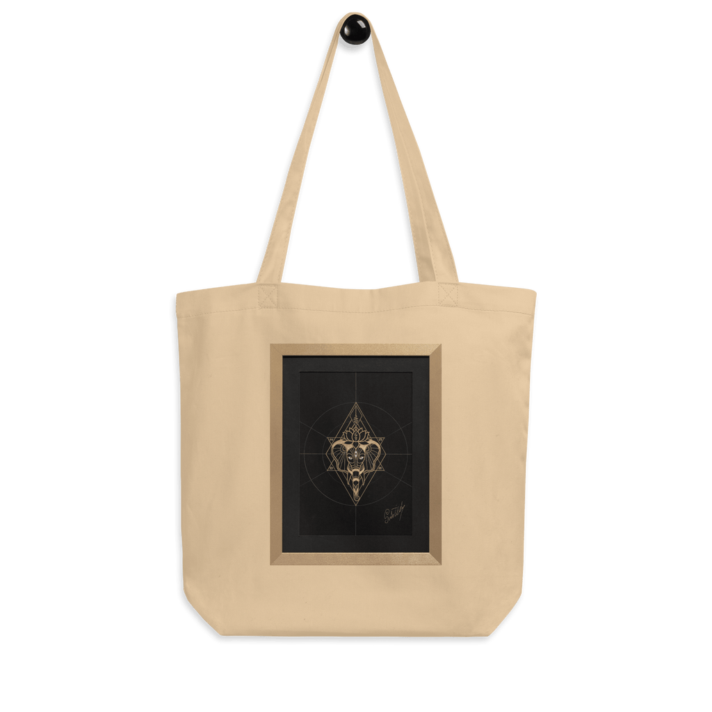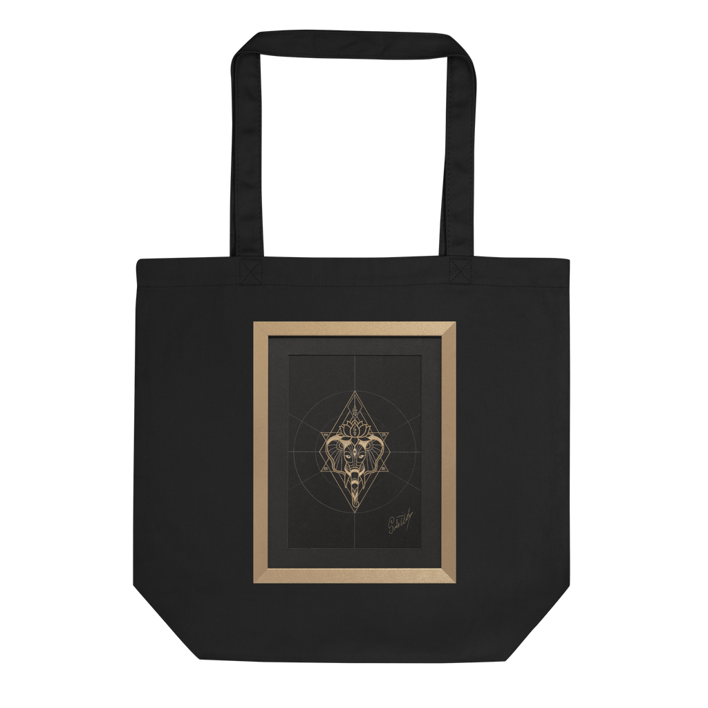 Enshrined within the golden geometries of the universe, the elephant bears the Padma lotus, a testament to the purity and expansive consciousness that arises from life's murky challenges. This artwork, with its harmonious blend of symbols, mirrors the balance of strength and grace, encouraging the onlooker to embrace a journey of inner truth and peace.