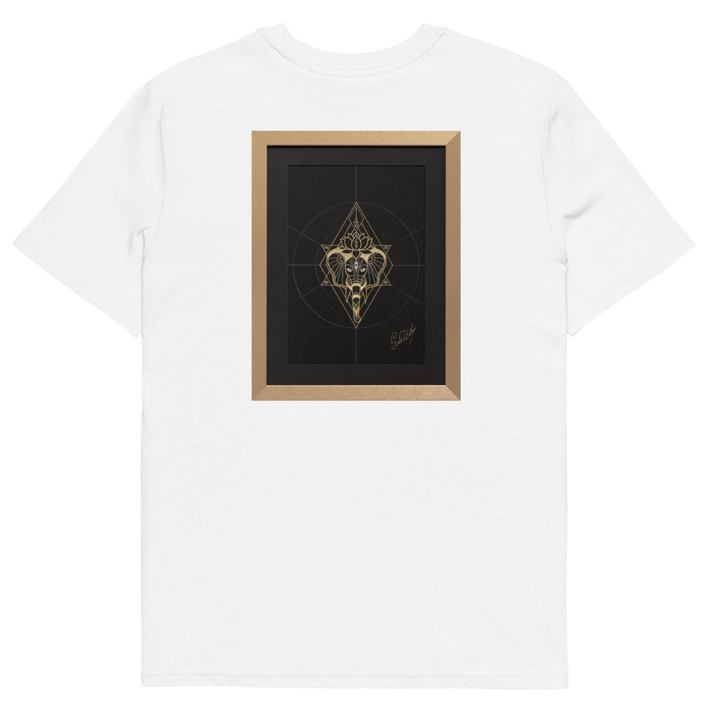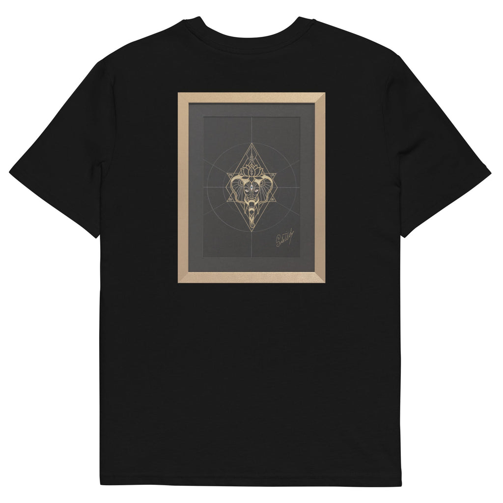 Enshrined within the golden geometries of the universe, the elephant bears the Padma lotus, a testament to the purity and expansive consciousness that arises from life's murky challenges. This artwork, with its harmonious blend of symbols, mirrors the balance of strength and grace, encouraging the onlooker to embrace a journey of inner truth and peace.