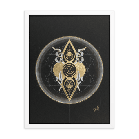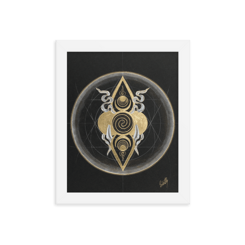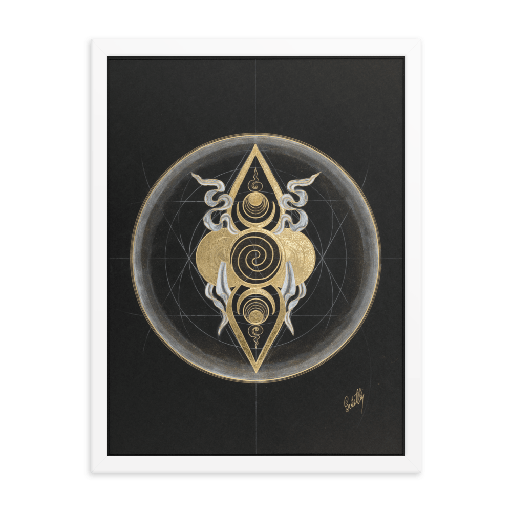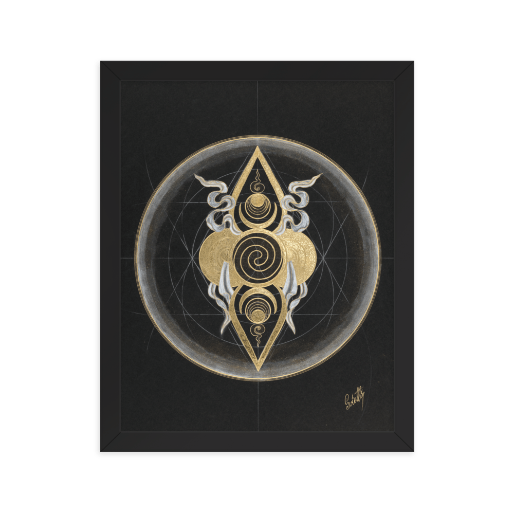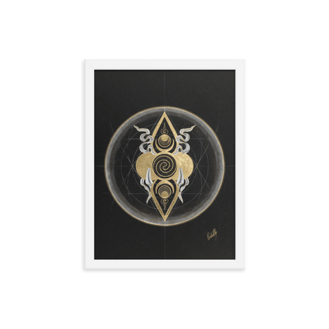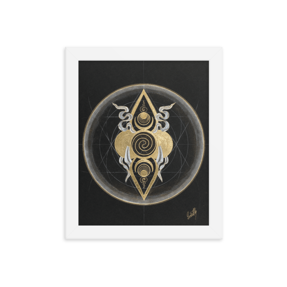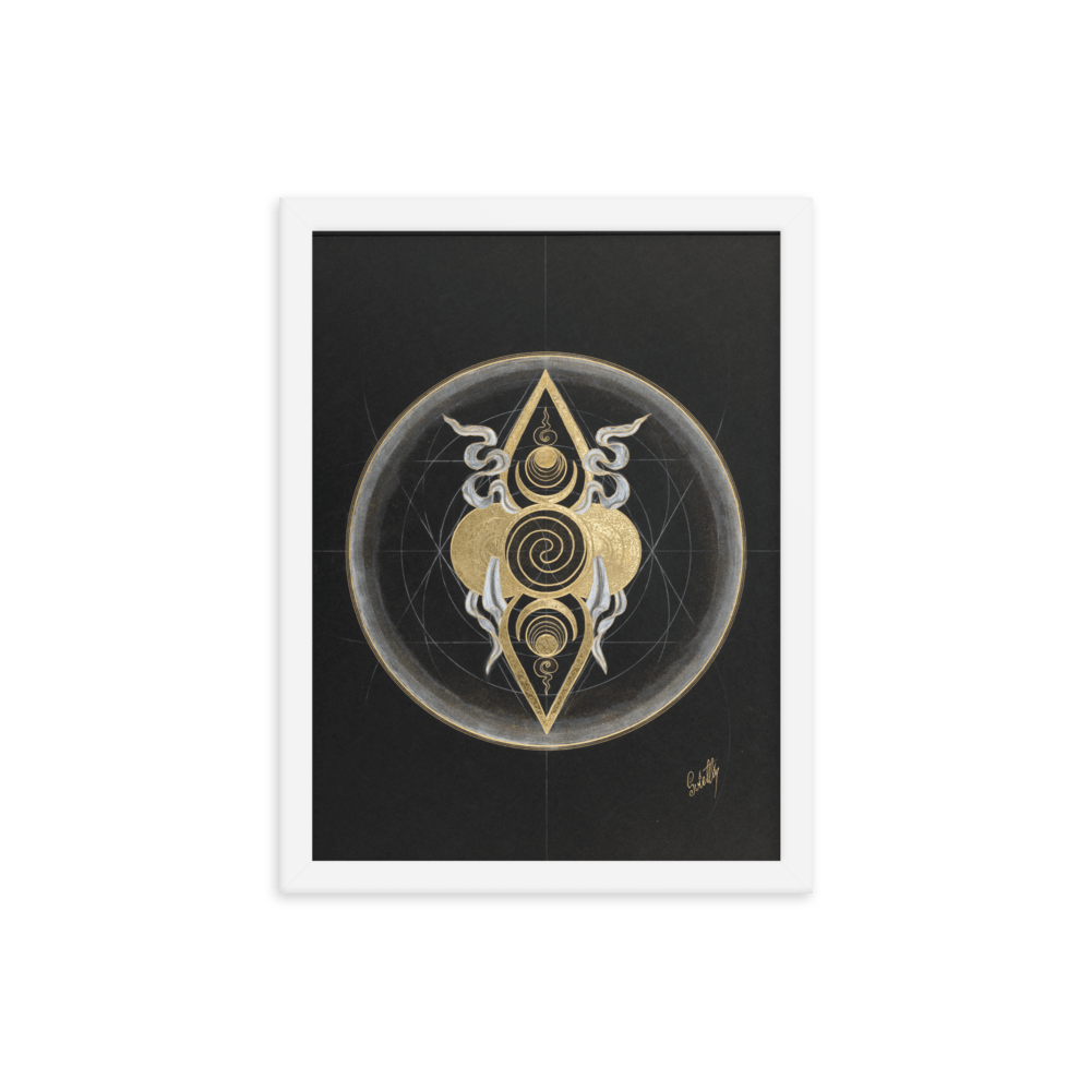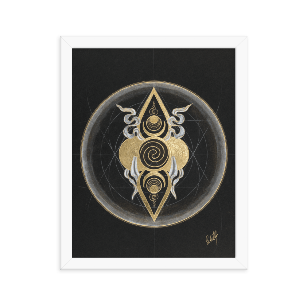 The artwork is mixed media. There is a glowing gold sparkling halo that encompasses the five senses offering.