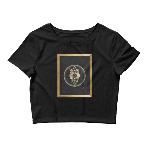 The artwork is mixed media. There is a glowing gold sparkling halo that encompasses the five senses offering.