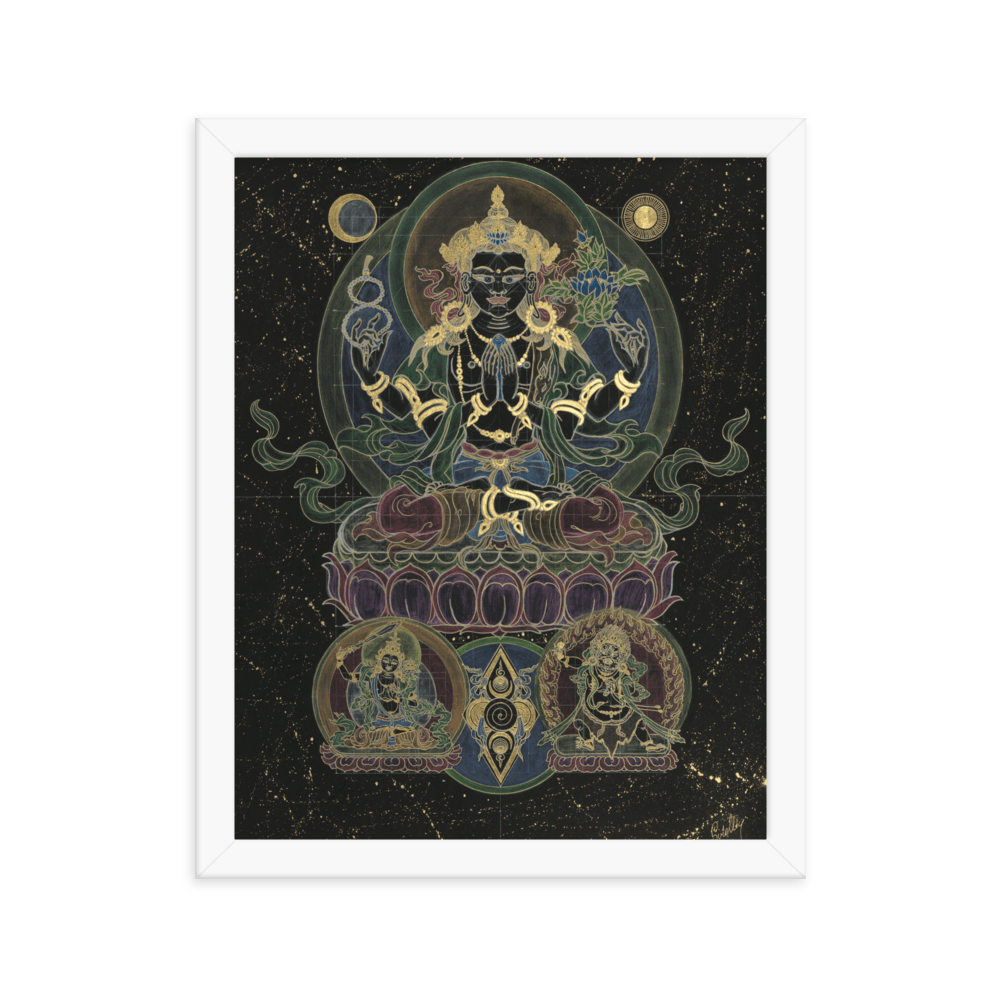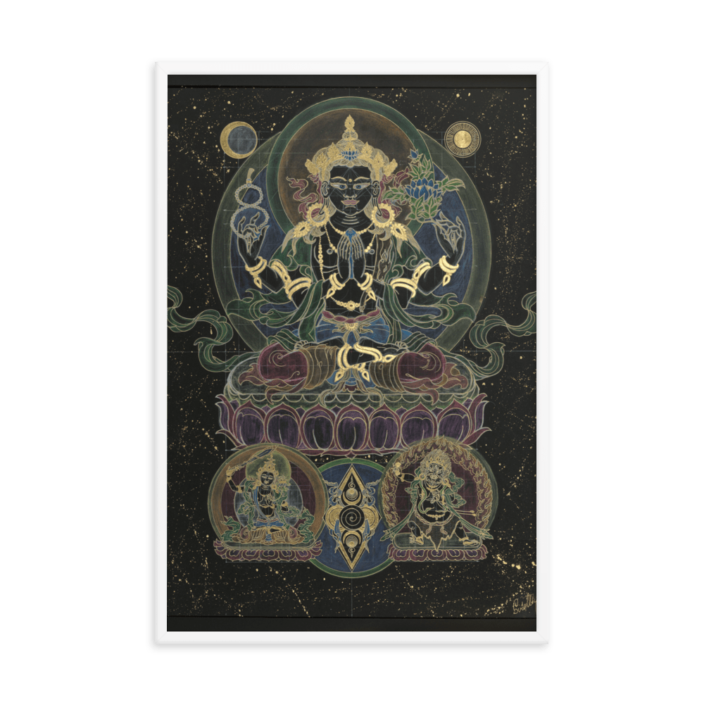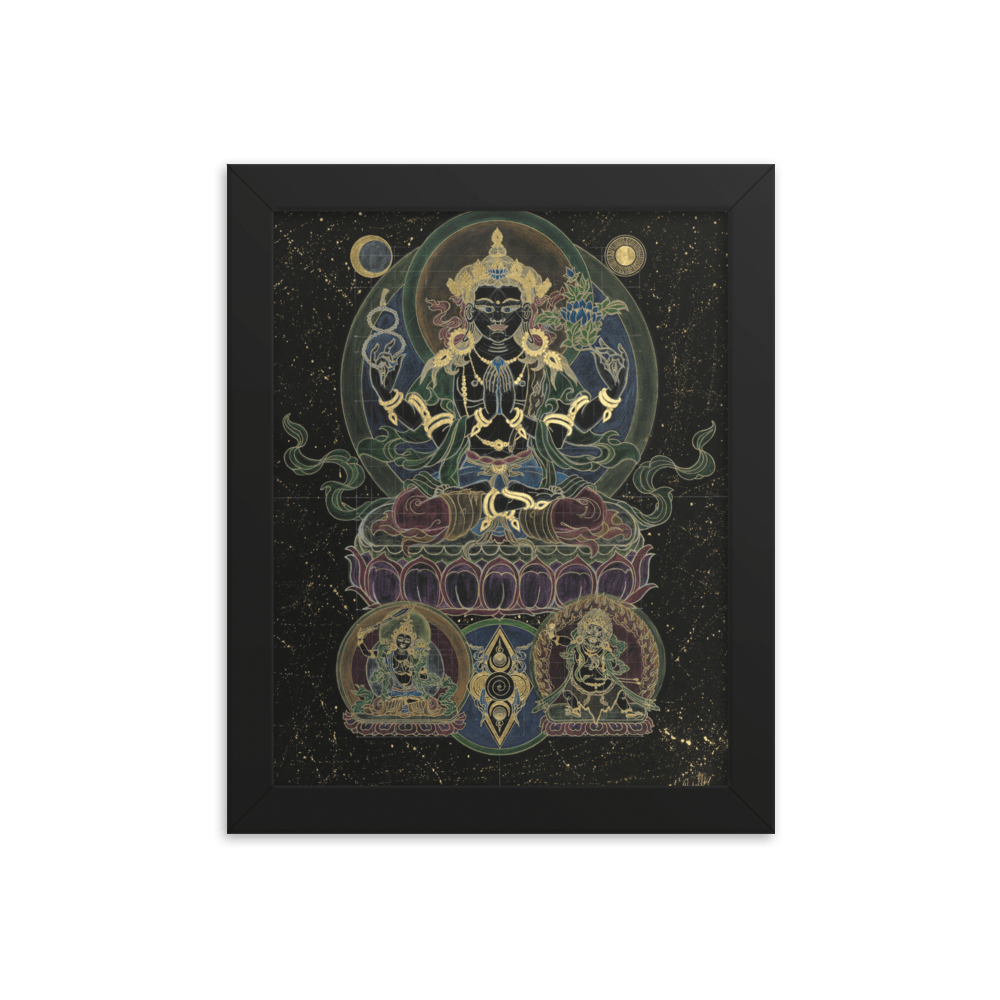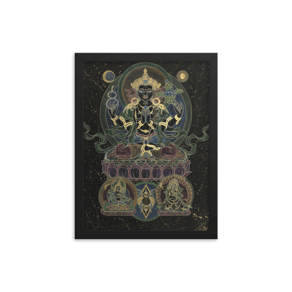 Avalokiteshvara sits at the center, embodying boundless compassion as the Bodhisattva who hears the cries of the world. To his left, Manjushri wields the flaming sword, cutting through the ignorance with his wisdom. To his right, Vajrapani radiates the spiritual strength to overcome obstacles on the path to spiritual realization. Above, the symbiosis of the Divine Masculine and Feminine signifies the perfect equilibrium necessary for the attainment of Nirvana.