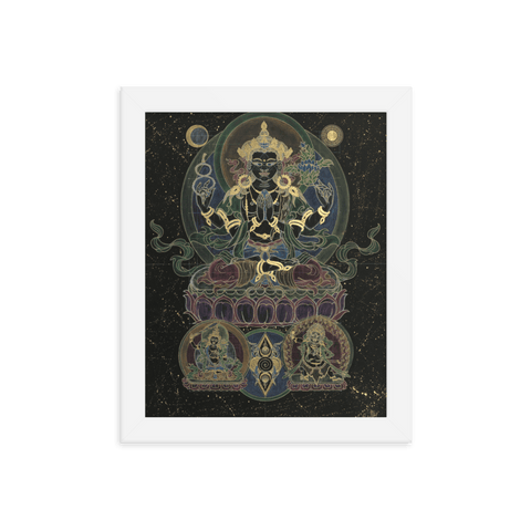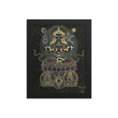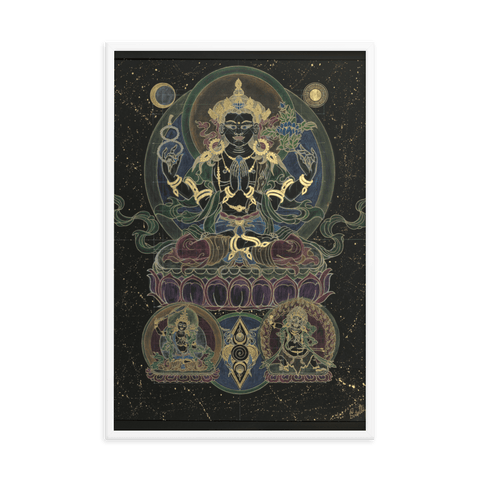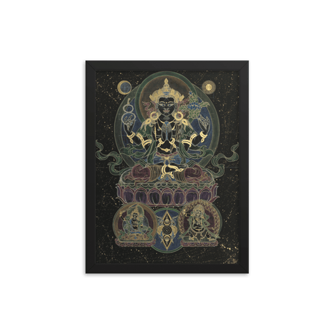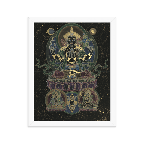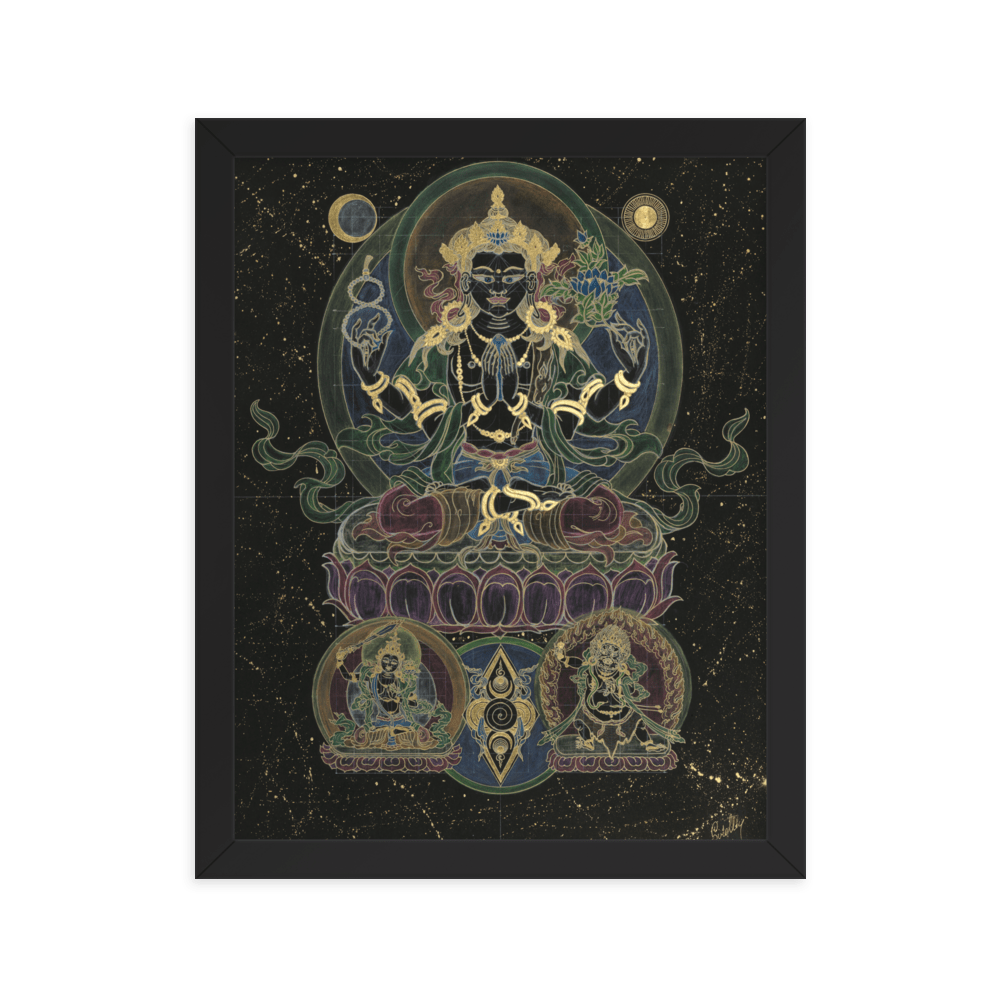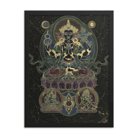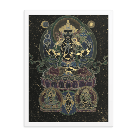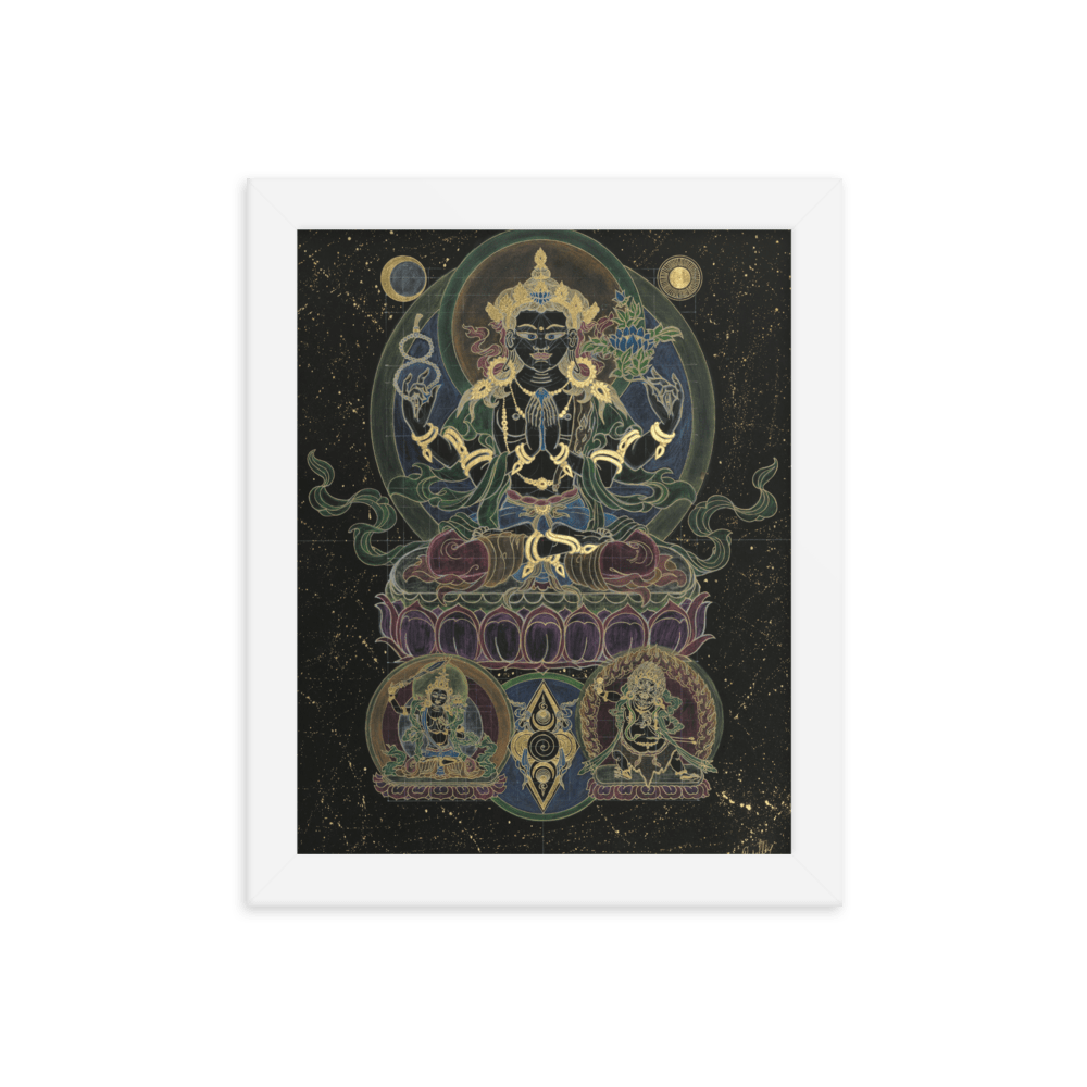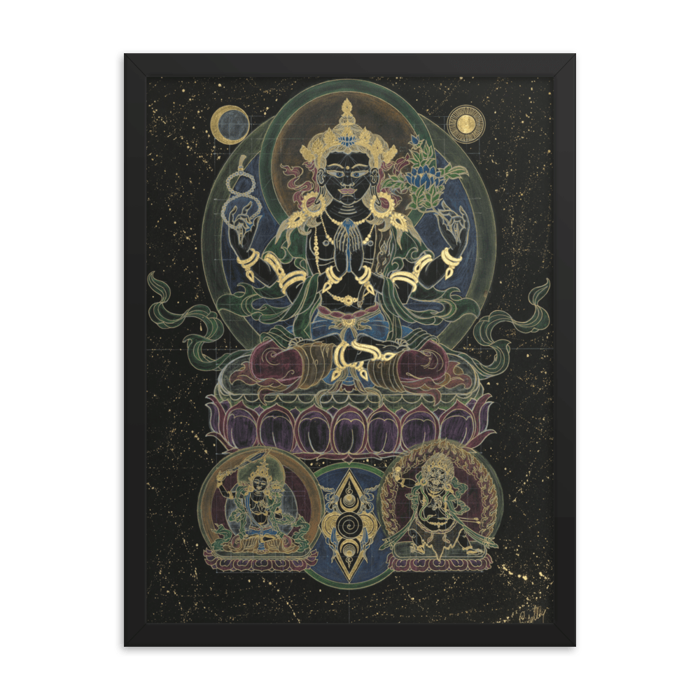 Avalokiteshvara sits at the center, embodying boundless compassion as the Bodhisattva who hears the cries of the world. To his left, Manjushri wields the flaming sword, cutting through the ignorance with his wisdom. To his right, Vajrapani radiates the spiritual strength to overcome obstacles on the path to spiritual realization. Above, the symbiosis of the Divine Masculine and Feminine signifies the perfect equilibrium necessary for the attainment of Nirvana.