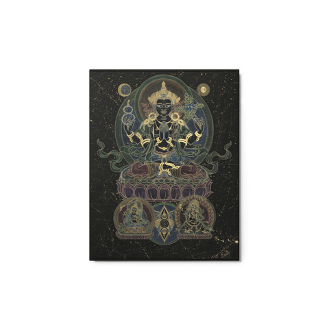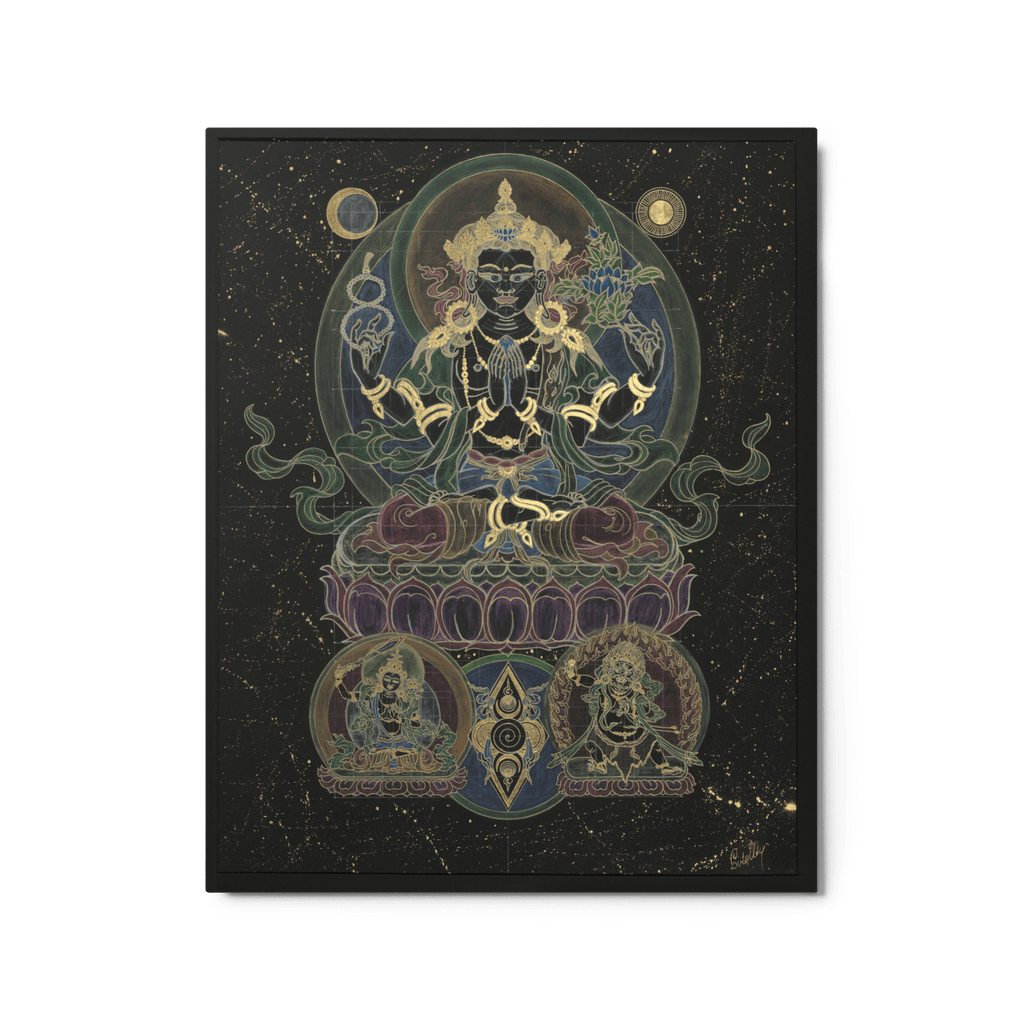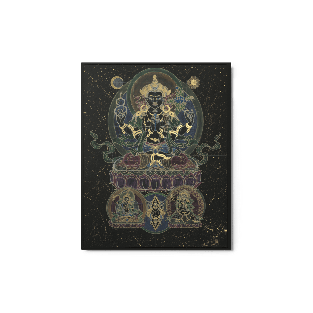 Avalokiteshvara sits at the center, embodying boundless compassion as the Bodhisattva who hears the cries of the world. To his left, Manjushri wields the flaming sword, cutting through the ignorance with his wisdom. To his right, Vajrapani radiates the spiritual strength to overcome obstacles on the path to spiritual realization. Above, the symbiosis of the Divine Masculine and Feminine signifies the perfect equilibrium necessary for the attainment of Nirvana.