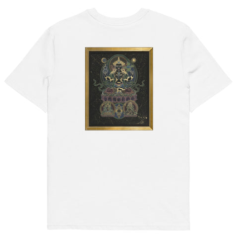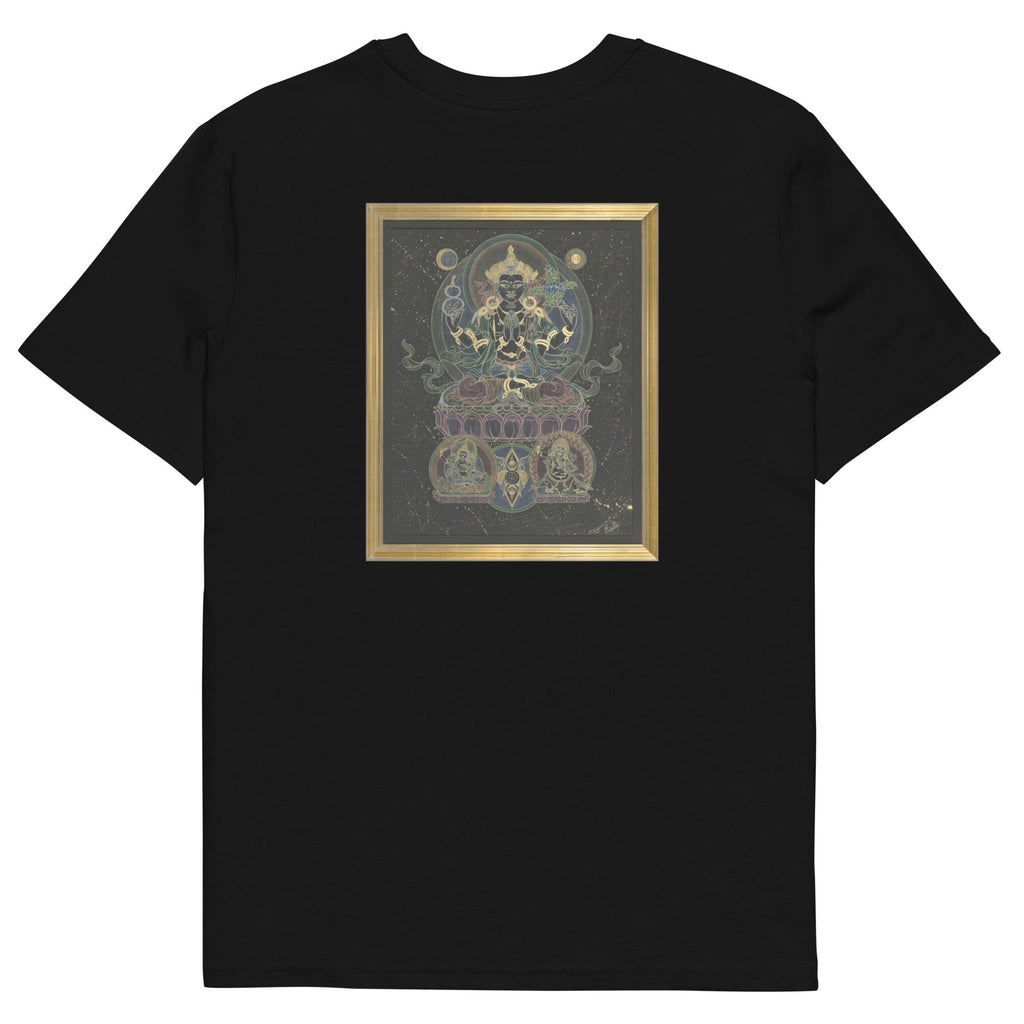 Avalokiteshvara sits at the center, embodying boundless compassion as the Bodhisattva who hears the cries of the world. To his left, Manjushri wields the flaming sword, cutting through the ignorance with his wisdom. To his right, Vajrapani radiates the spiritual strength to overcome obstacles on the path to spiritual realization. Above, the symbiosis of the Divine Masculine and Feminine signifies the perfect equilibrium necessary for the attainment of Nirvana.