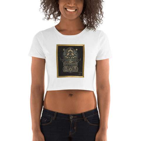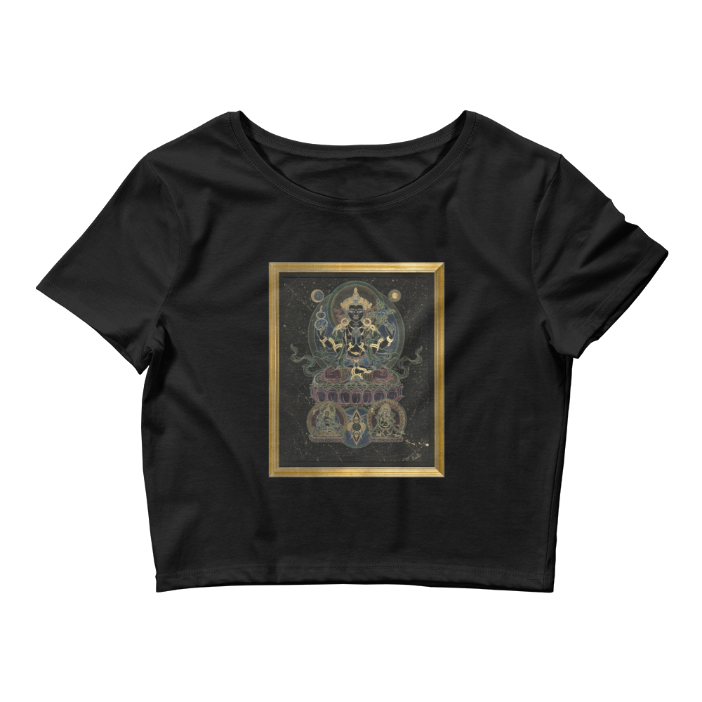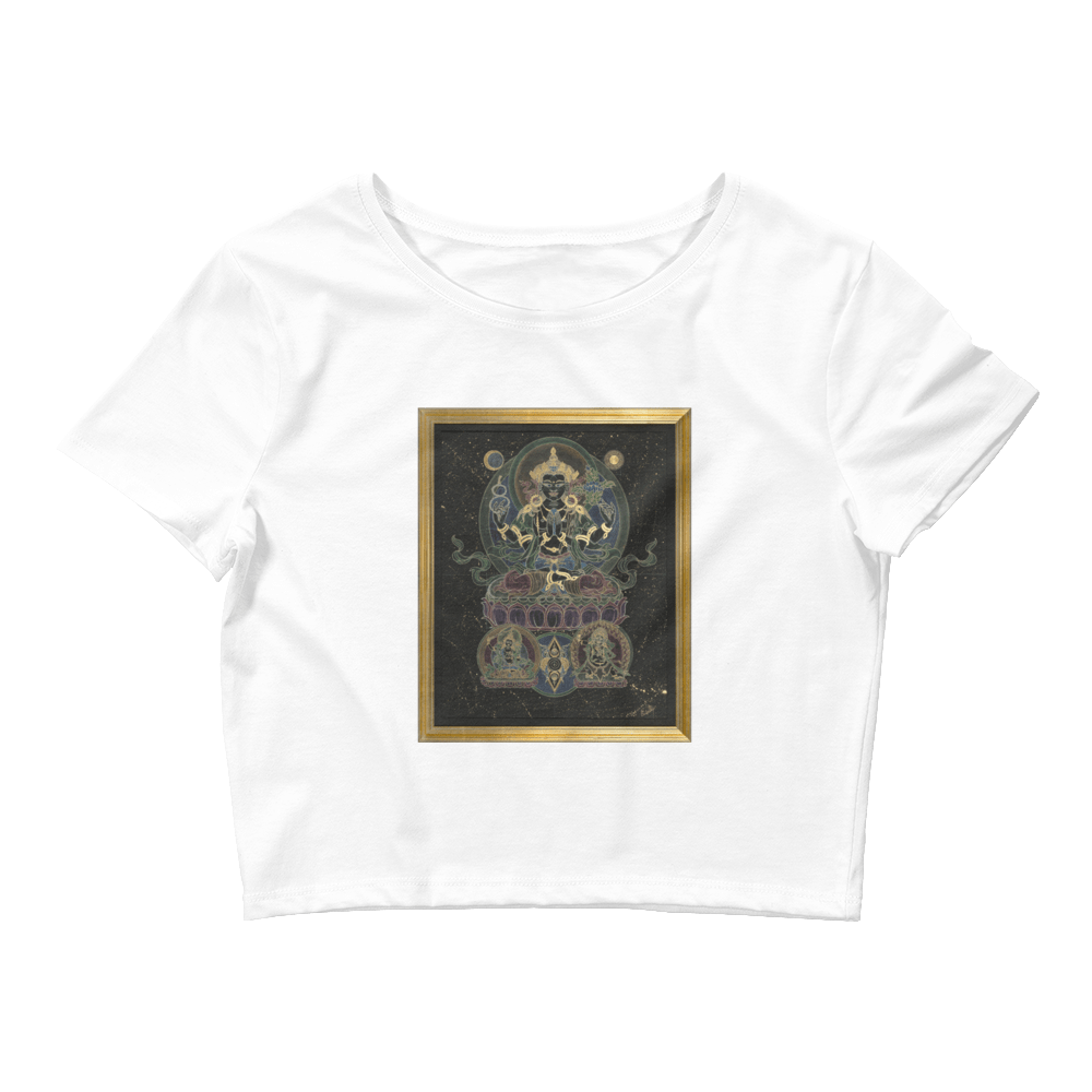 Avalokiteshvara sits at the center, embodying boundless compassion as the Bodhisattva who hears the cries of the world. To his left, Manjushri wields the flaming sword, cutting through the ignorance with his wisdom. To his right, Vajrapani radiates the spiritual strength to overcome obstacles on the path to spiritual realization. Above, the symbiosis of the Divine Masculine and Feminine signifies the perfect equilibrium necessary for the attainment of Nirvana.
