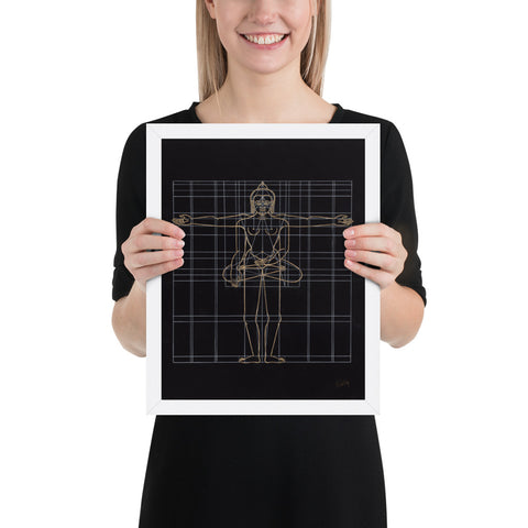 In this Artwork you see Shakyamuni Buddha's perfect body proportions while standing as well as while sitting in the attitude of The Bhumisparsa Mudra or, “The Gesture of Witness.” This plays an important role in the history of the historical Buddha. While Buddha meditated under the Bodhi tree, he was disturbed by Mara, the god of sensual desire, who tempted him by taking the form of a naked girl. But Siddhartha would not deviate from his path to enlightenment, and so he touched the earth with the fingertips of his right hand and said, “the earth shall be my witness, I will not let myself be seduced.”