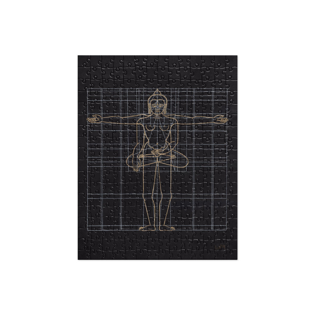 In this Artwork you see Shakyamuni Buddha's perfect body proportions while standing as well as while sitting in the attitude of The Bhumisparsa Mudra or, “The Gesture of Witness.” This plays an important role in the history of the historical Buddha. While Buddha meditated under the Bodhi tree, he was disturbed by Mara, the god of sensual desire, who tempted him by taking the form of a naked girl. But Siddhartha would not deviate from his path to enlightenment, and so he touched the earth with the fingertips of his right hand and said, “the earth shall be my witness, I will not let myself be seduced.”