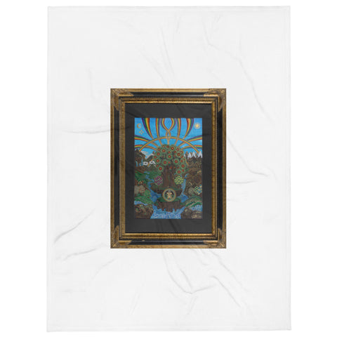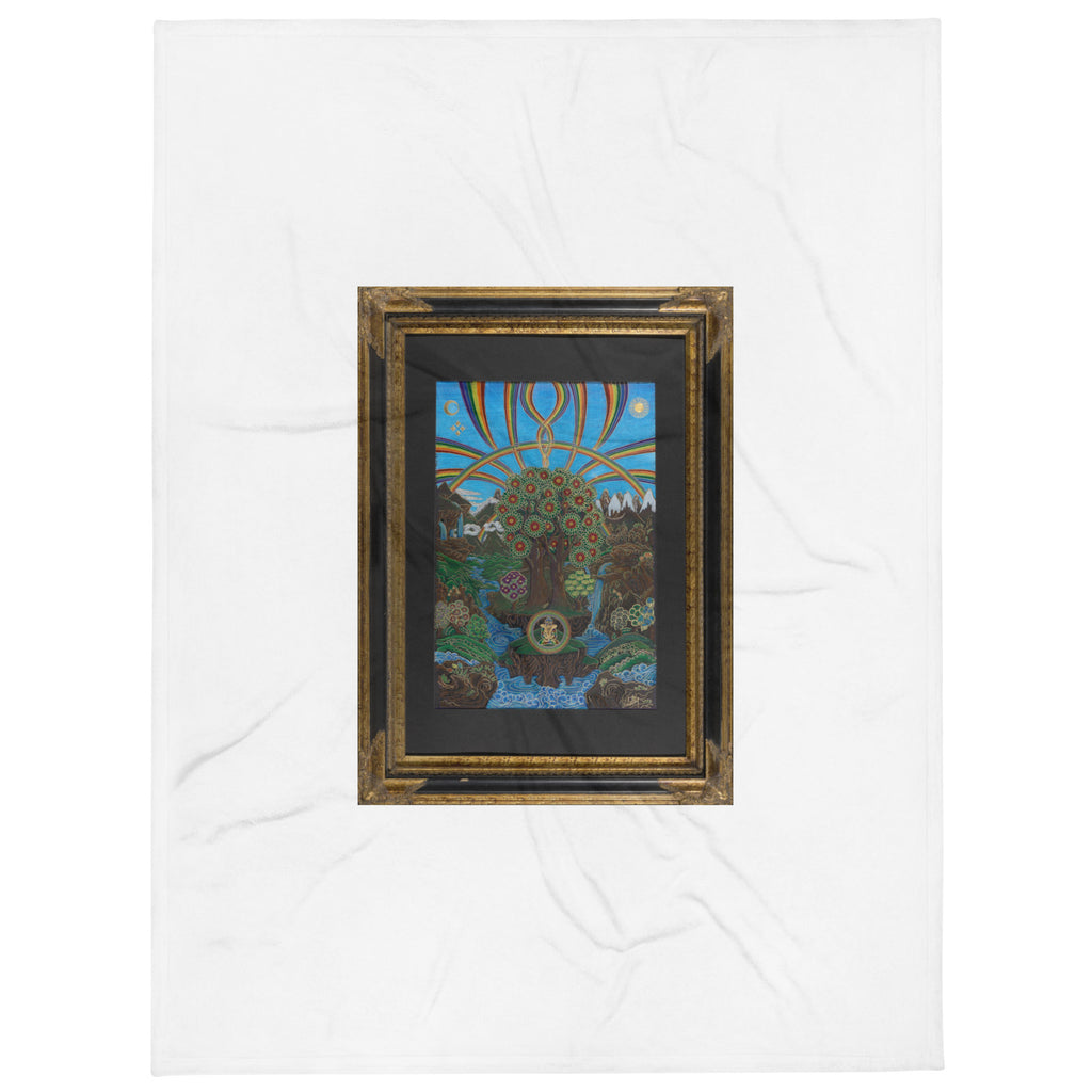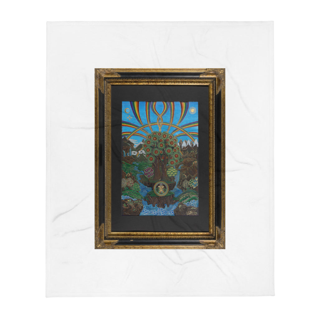At the bottom of this artwork, you see in the circle a depiction of wisdom and compassion with YabYum. The rainbows, running water, mountains and eucalyptus trees all serve as the symbolism of abundance. At the top, you can see the balance of Divine Feminine and Divine Masculine being showcased in the artwork as this is the true energetic nature of this land.
