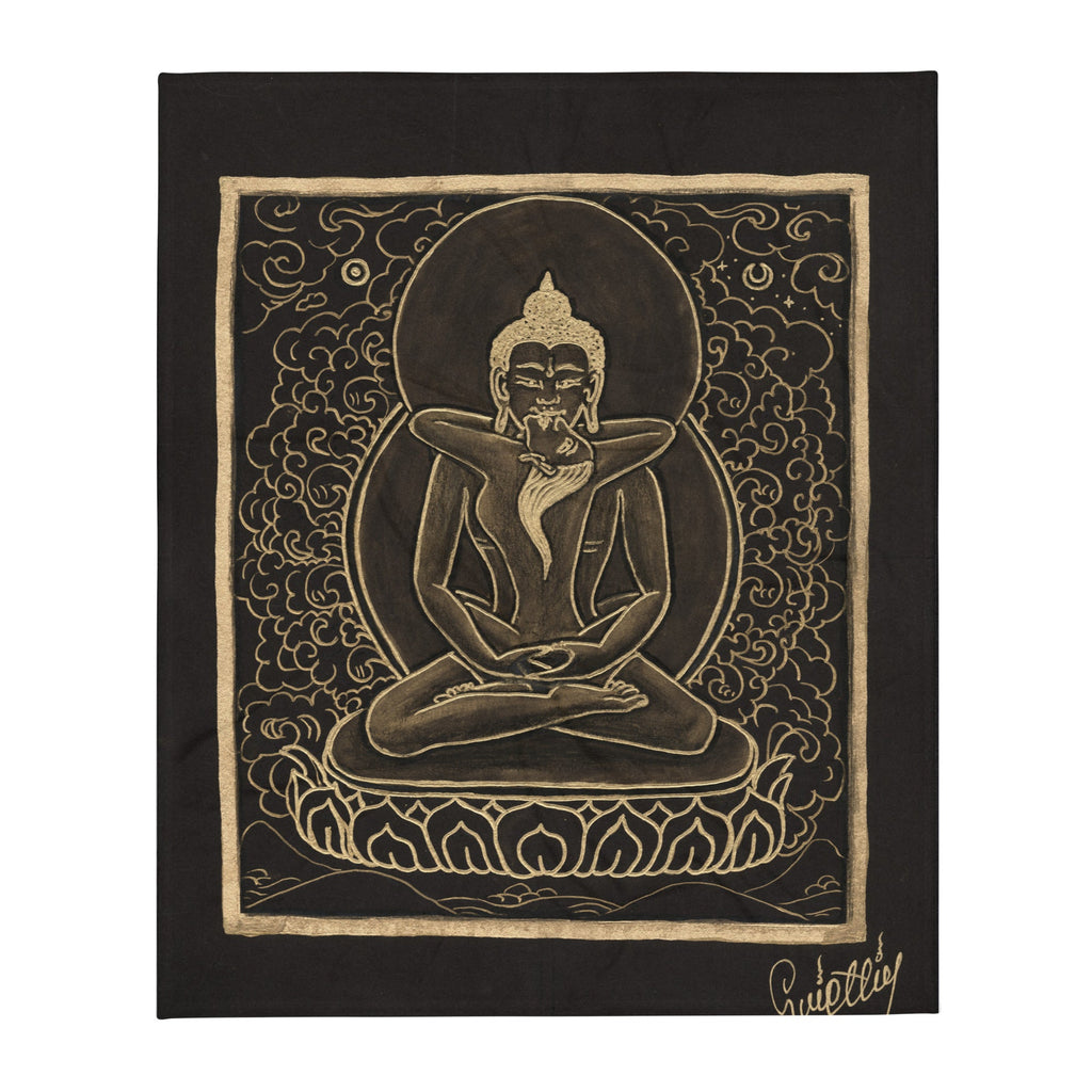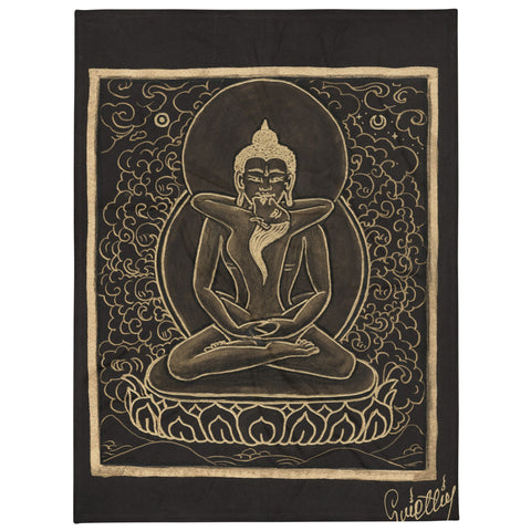 Yab-yum in Tibetan is translated literally as, "father-mother." It is a common symbol throughout Buddhist traditions. Yab-Yum represents the masculine and feminine union of wisdom and compassion, as depicted by a male and female deity. The male figure represents compassion and skill, while the female partner represents wisdom and insight. Both are necessary for enlightenment. In the Yab-Yum posture, the female is seated on the male’s lap. There is a rare presentation of a similar figure but reversed, with the male sitting on the female’s lap, called Yum-Yab.